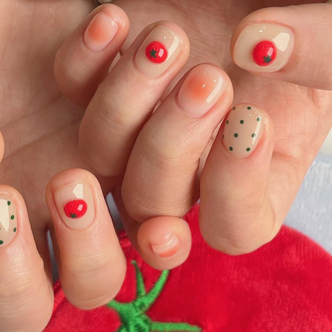 Бежевый лак с красным дизайном смотрится очень эффектно! На некоторых ногтях пусть будут узоры помидорок, а на других размести объемные фигурки или просто красный градиент-ауру. Такой маникюр точно не останется без внимания.