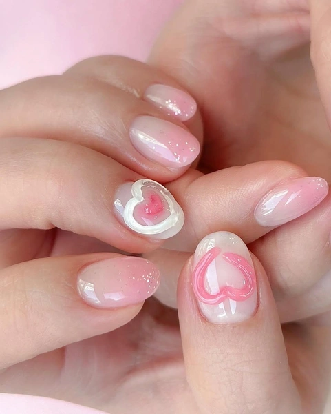 Если классический молочный однотон надоел, преврати его в дизайн. На нескольких ногтях сделай градиент с розовым блестящим лаком, а на других пусть будут объемные фигурки сердечек. Получится стильно и очень нежно!