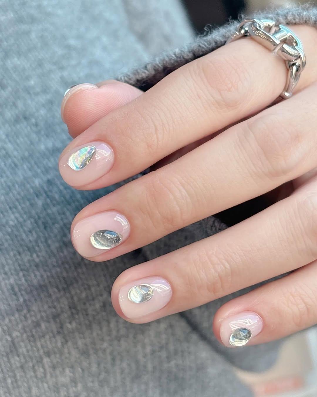 В этом дизайне ногтей тоже основа сделана нюдово-молочным лаком. А поверх нее расположены крупные объемные элементы, напоминающие стразы. На самом деле это кусочки фольги, покрытые гелем, но выглядят они очень круто!