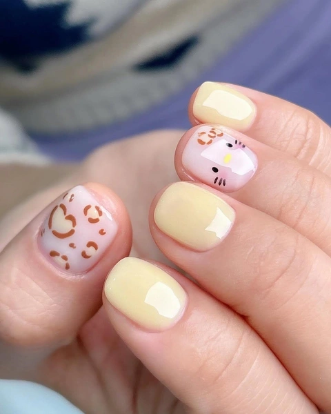 Любительницы цвета сливочного масла могут сочетать такой лак с милыми дизайнами. На одном ноготке нарисуй мордочку Hello Kitty, а другой укрась анималистичным принтом. Получится нежно, но не так банально, как однотонный лак!
