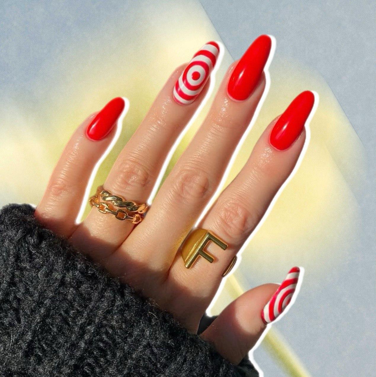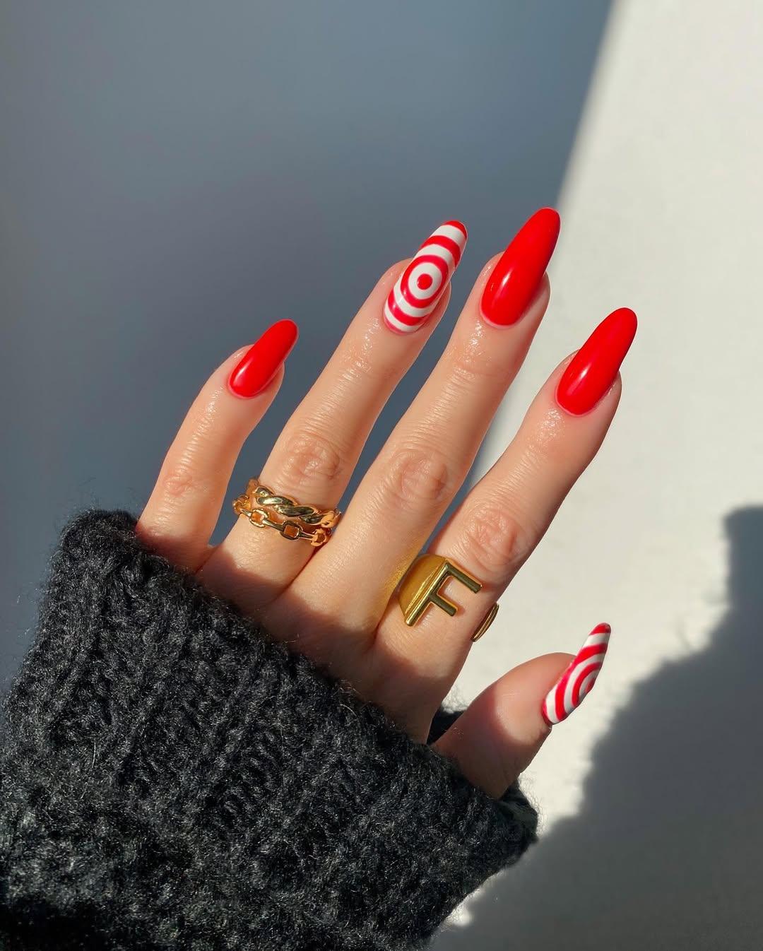 На все ногти нанеси красный лак в пару слоев, а на одном нарисуй дизайн в виде большой белой спирали. Такой маникюр будет выглядеть очень необычно за счет такого рисунка, но вообще-то ничего сложного в нем нет. Для повторения тебе нужны только лаки и тонкая кисть.