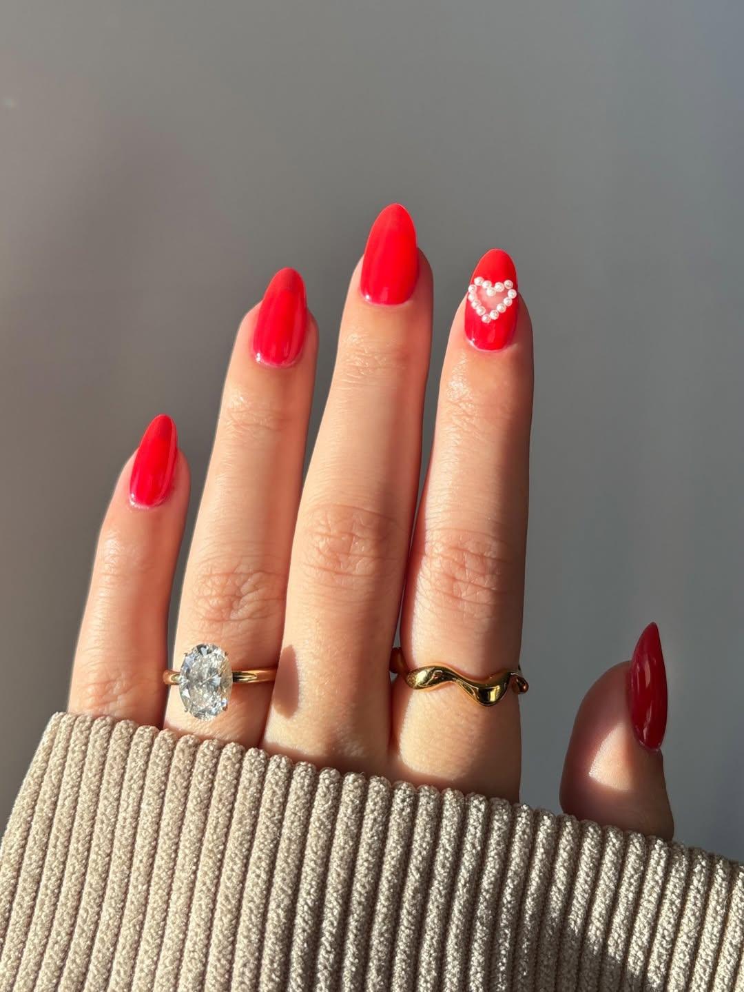 В этом маникюре самым красивым дизайном будут переливающиеся сердечки. Приклей одно из них на красный ноготь, а другое — на нюдовый. На остальных же нарисуй узор в горошек или просто оставь их однотонными. Это очень простой в исполнении, но эффектный нейл-арт.