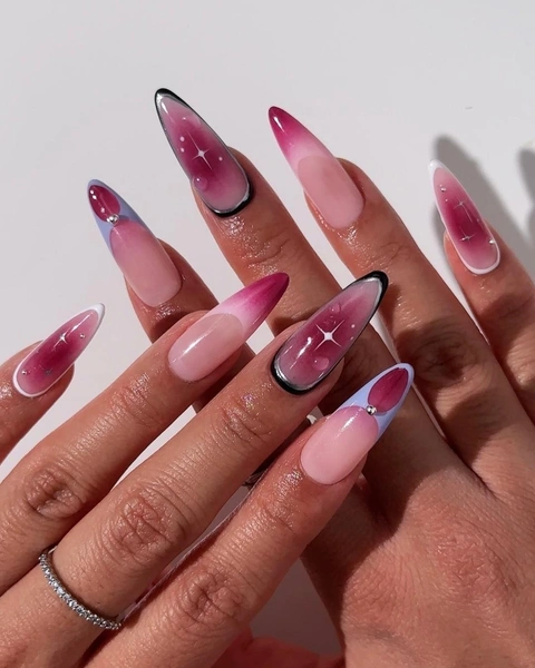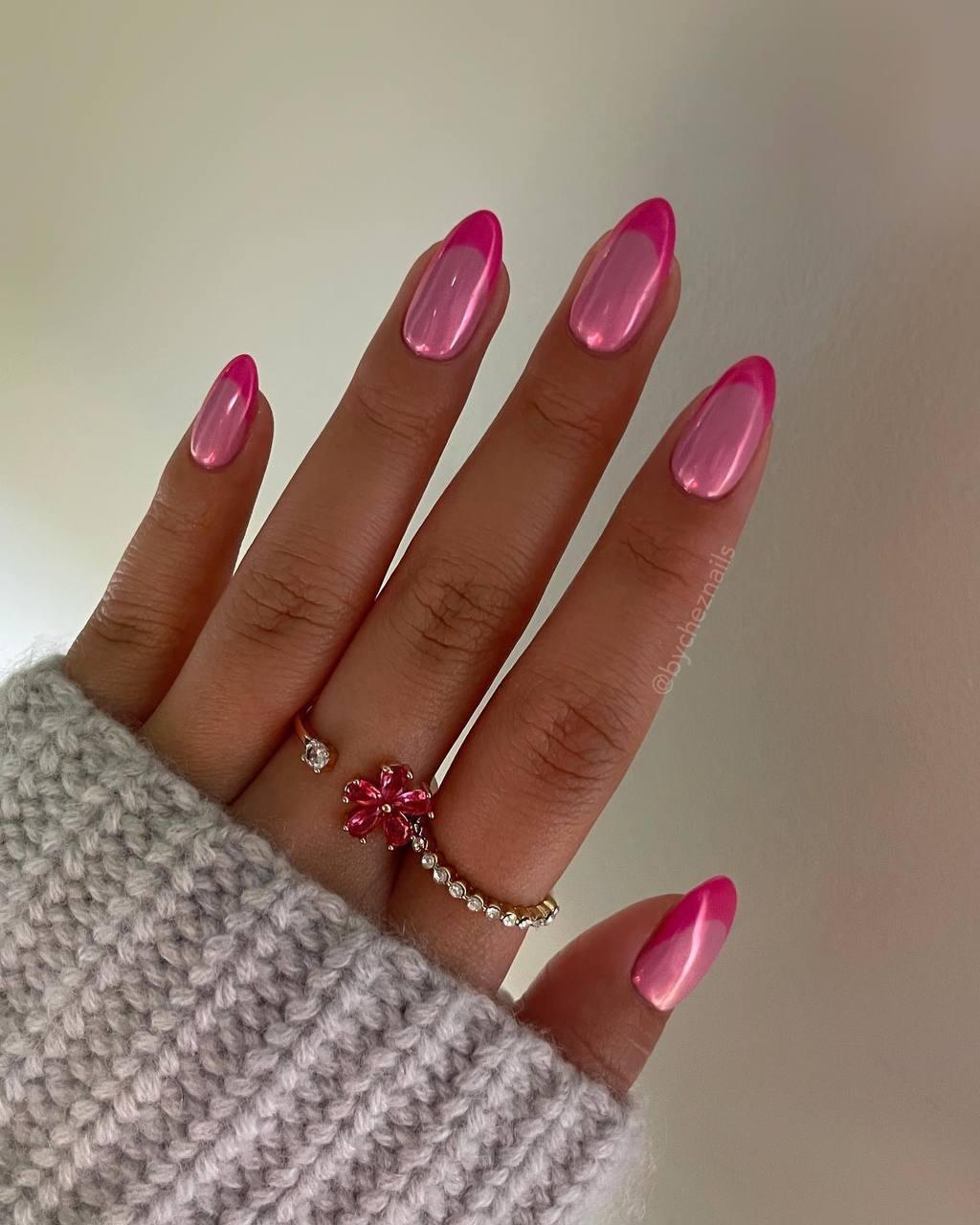 Этот вариант для тех, кто любит быть в центре внимания. Здесь используется ярко-розовая втирка с металлическим эффектом и контрастный темный на кончиках. Такой маникюр на миндалевидной форме выглядит очень современно и дерзко. Он отлично переливается на свету и заменяет любые украшения.