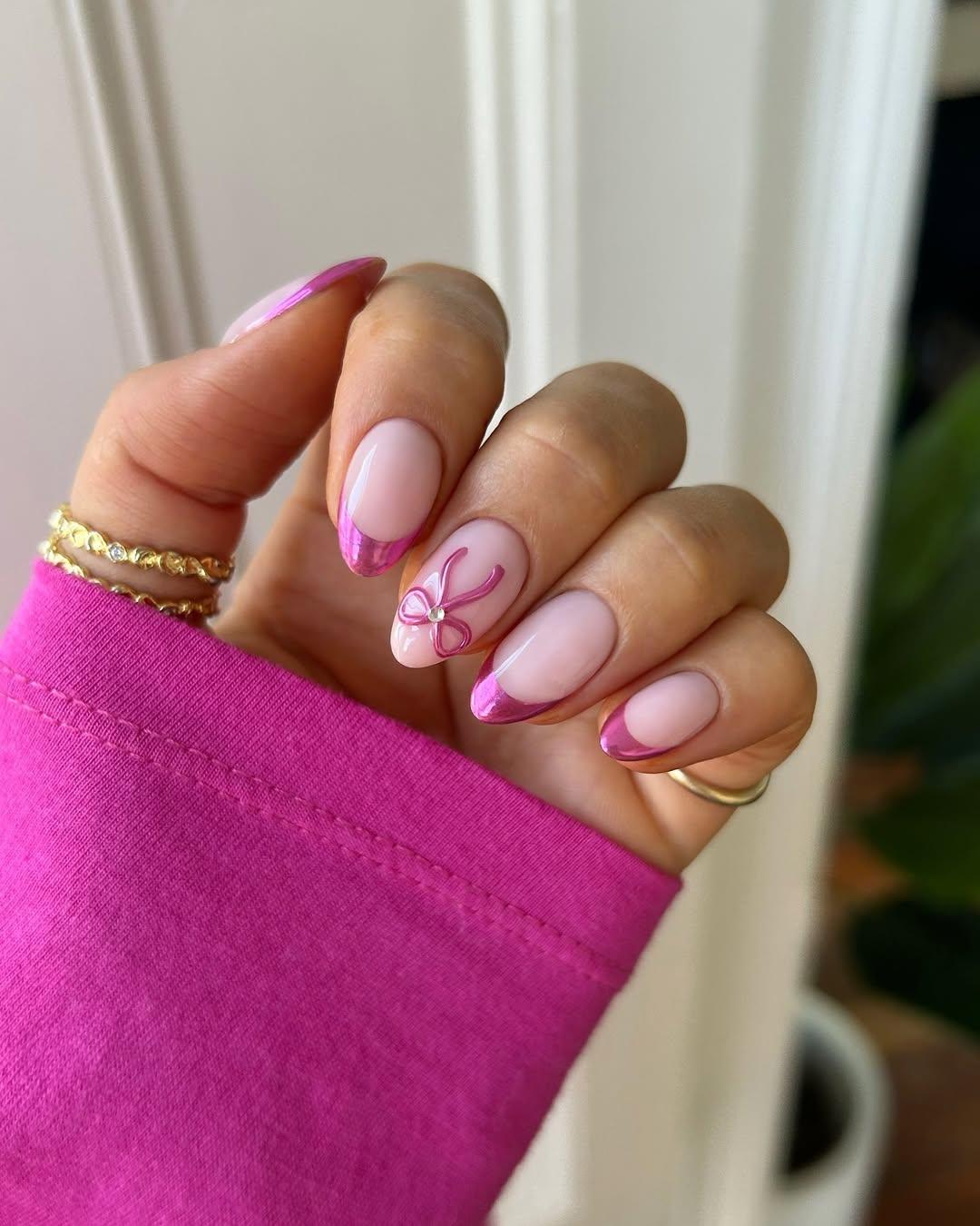 Стиль coquettecore все еще с нами, и этот маникюр тому подтверждение. Тонкий розовый металлический френч дополнен объемным розовым бантиком на безымянном пальце. Дизайн выглядит очень женственно и необычно. Он точно привлечет внимание к твоим рукам и соберет кучу комплиментов.