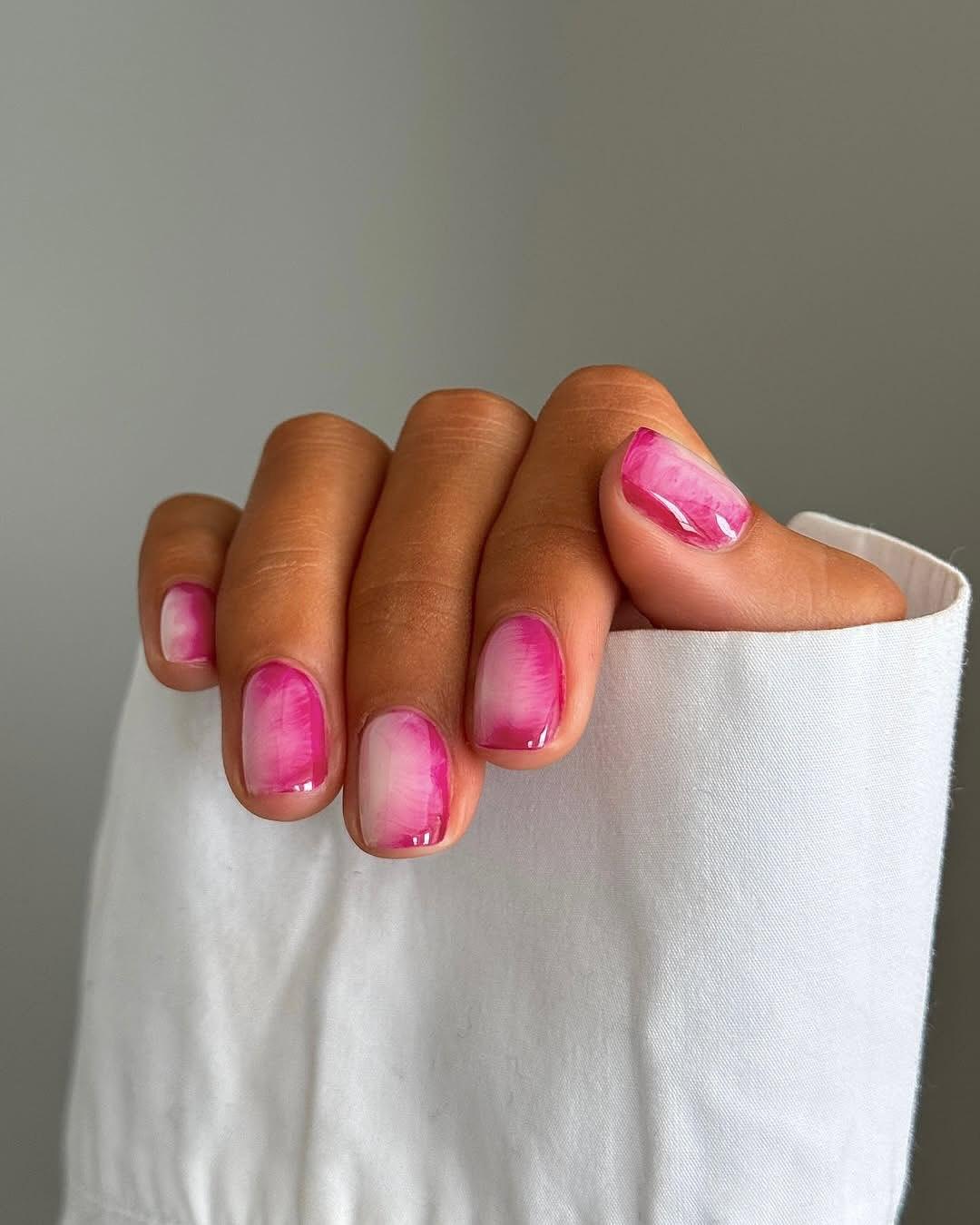 Красивая нюдовая база сочетается с нежными розовыми разводами. Такой маникюр очень легко сделать, но при этом он остается красивым и притягательным. Это отличный выбор для тех, кто ценит минимализм и эстетику «тихой роскоши».