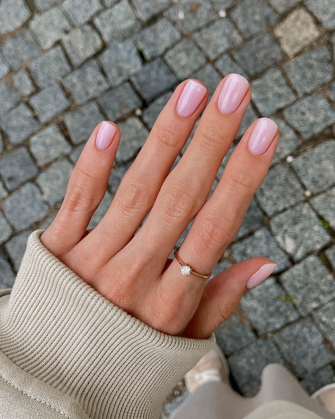 Иногда лучшее решение — это просто безупречный однотон. Очень светлый розовый оттенок с плотным глянцевым топом выглядит свежо и чисто. Такой маникюр подходит под любой гардероб и всегда смотрится уместно.