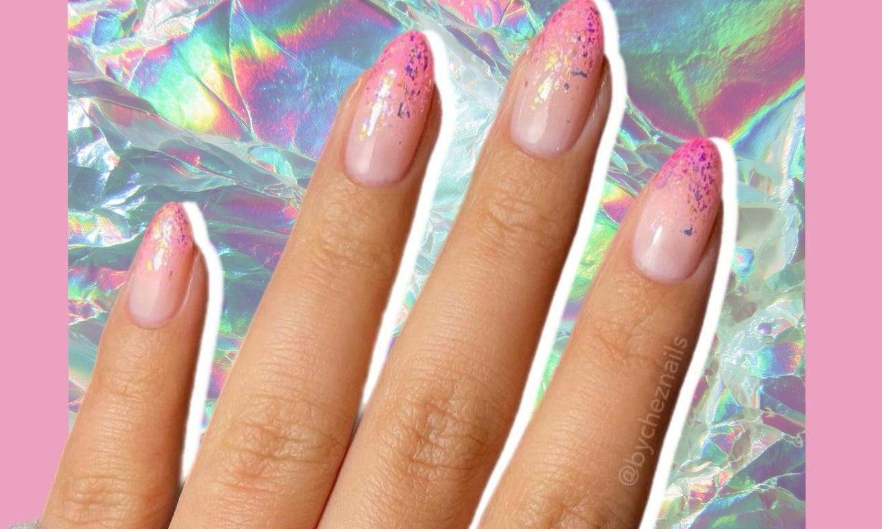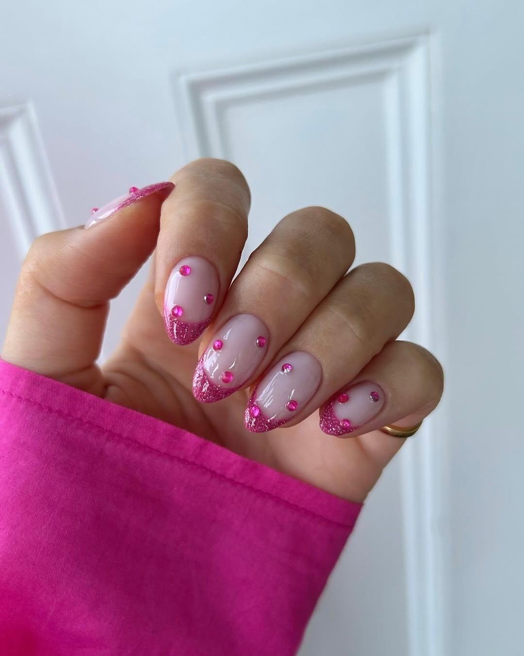 Этот дизайн сочетает в себе сразу несколько трендов: сияющие кончики и розовые стразы. Розовые блестки на кончиках создают эффект градиента, а мелкие камушки добавляют объема. Такой маникюр идеально подойдет для праздника или если тебе просто хочется добавить в жизнь немного блеска.