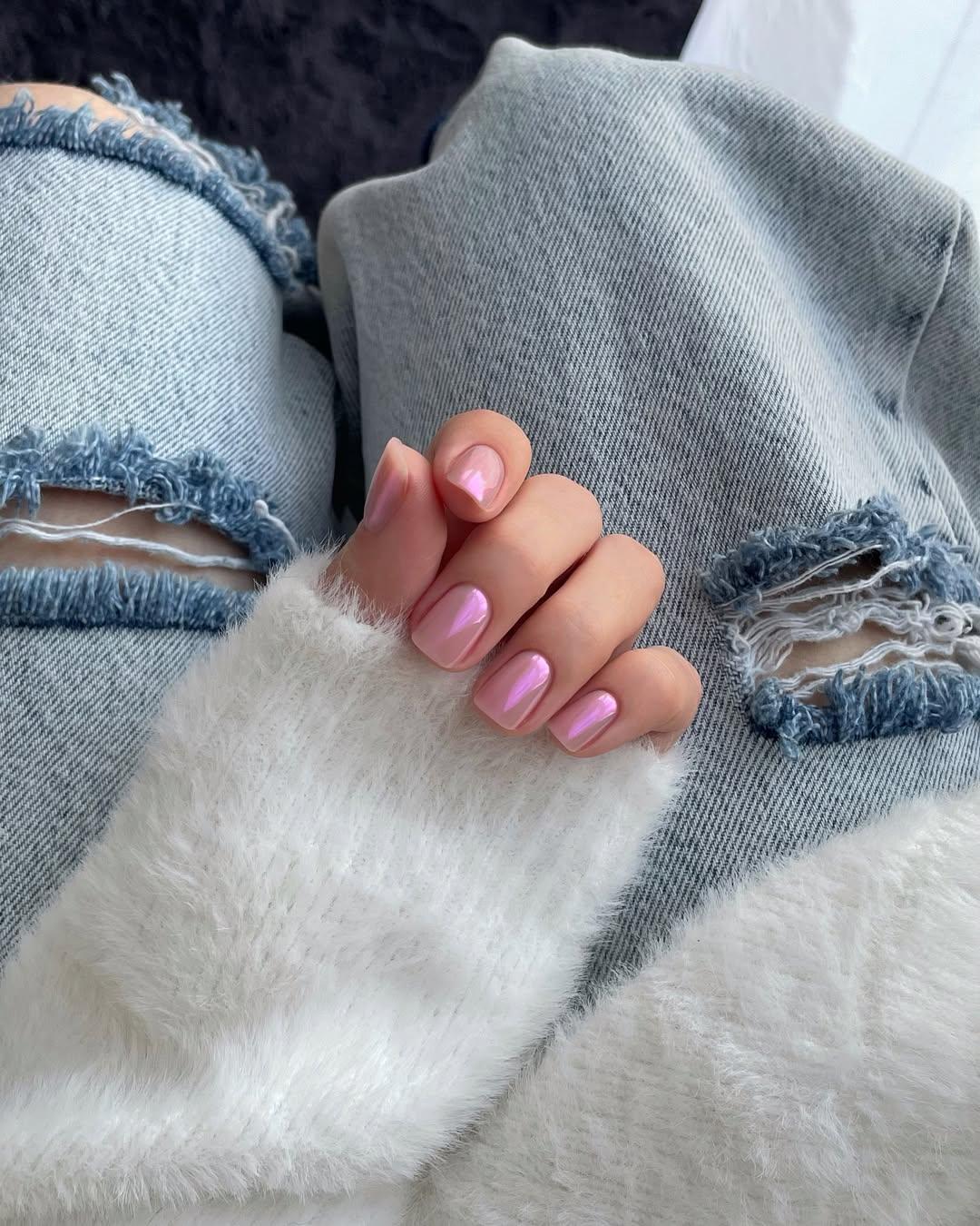 Если ты предпочитаешь короткие ногти, присмотрись к этому нежному дизайну. На розовую базу нанесена жемчужная втирка, которая создает мягкий перелив. Это идеальный вариант под уютные белые свитеры и пушистые варежки. Маникюр выглядит очень аккуратно и дорого.