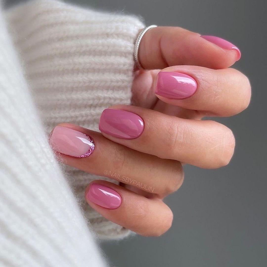 Здесь за основу взят насыщенный розовый оттенок. Изюминка дизайна — блестящая каемка на одном из ногтей, которая напоминает россыпь мелких камней. Это простой способ добавить немного праздника в повседневный образ. Такой маникюр выглядит сдержанно, но совсем не скучно.
