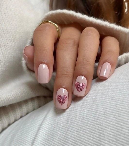 На нежно-розовом фоне нарисованы крупные сердца, полностью заполненные розовым глиттером. Это классический романтичный дизайн, который никогда не выходит из моды. Он хорошо смотрится на квадратной форме и добавляет образу игривости. А блестки будут красиво мерцать при вечернем освещении.