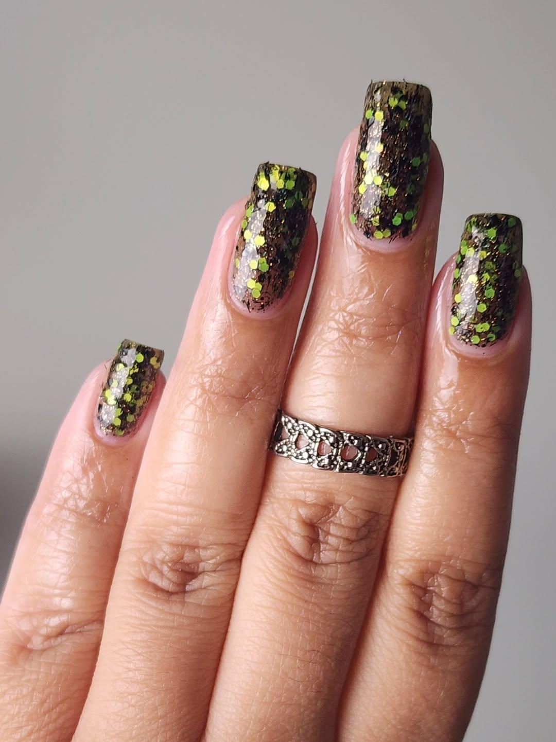 А что, если выбрать зеленый цвет не как основу маникюра, а как цвет блесток? В таком случае советую сочетать коричневый лак с мелким шиммером с крупным зеленым глиттером. Такое комбо объединяет в себе природную эстетику и вайб праздничных вечеринок.