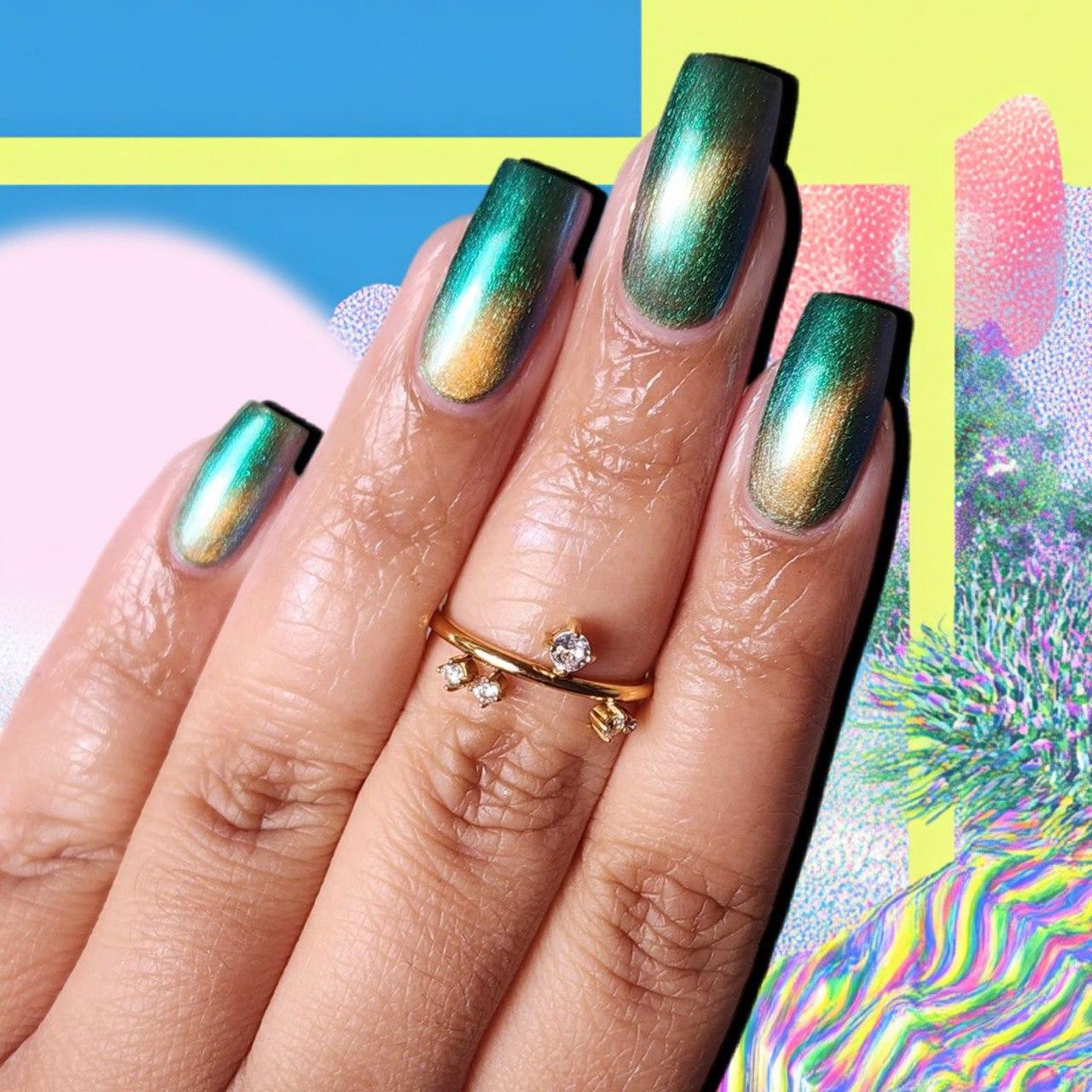 Комбинация яркого зеленого с оранжевыми переливами просто завораживает. Если ты сделаешь такой маникюр, то точно будешь постоянно засматриваться на него. Да и окружающие точно заметят такой необычный лак с эффектом «кошачий глаз».