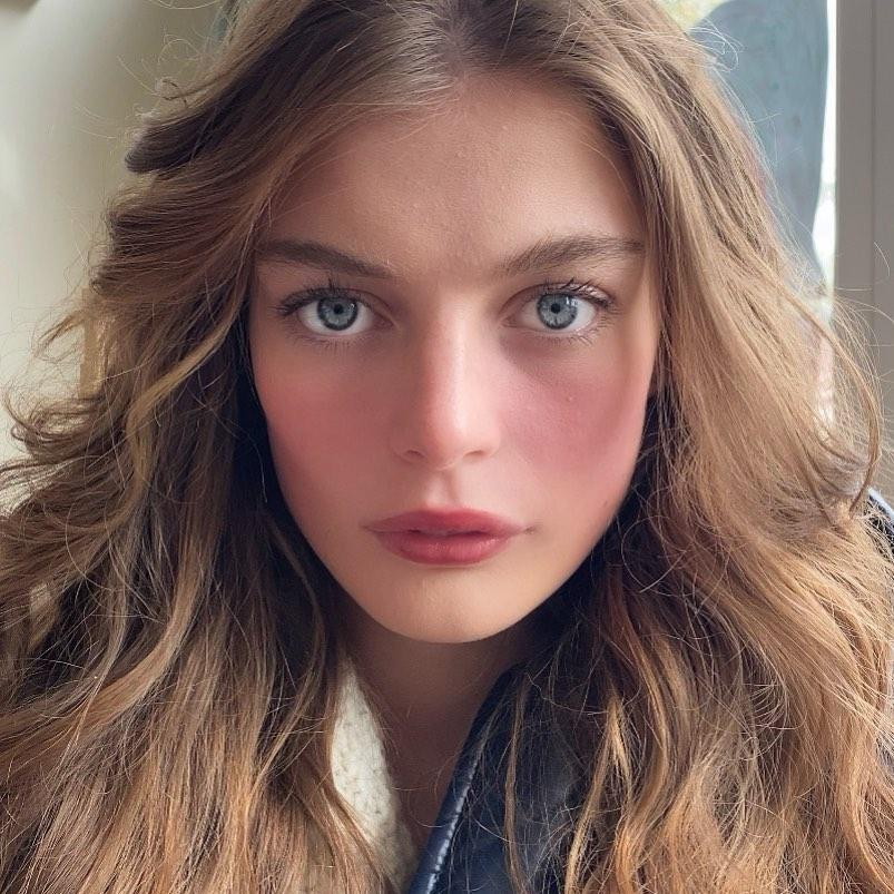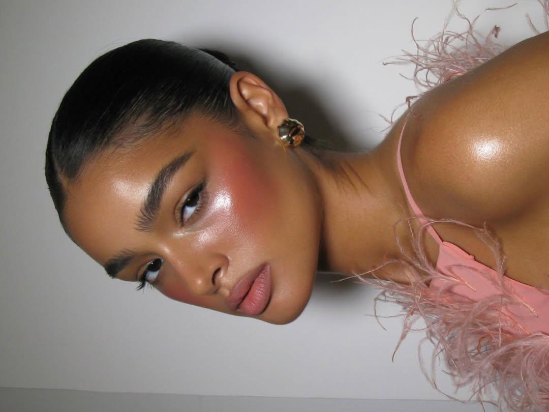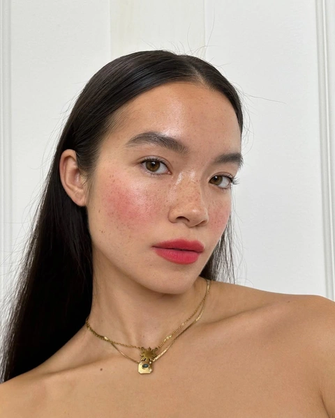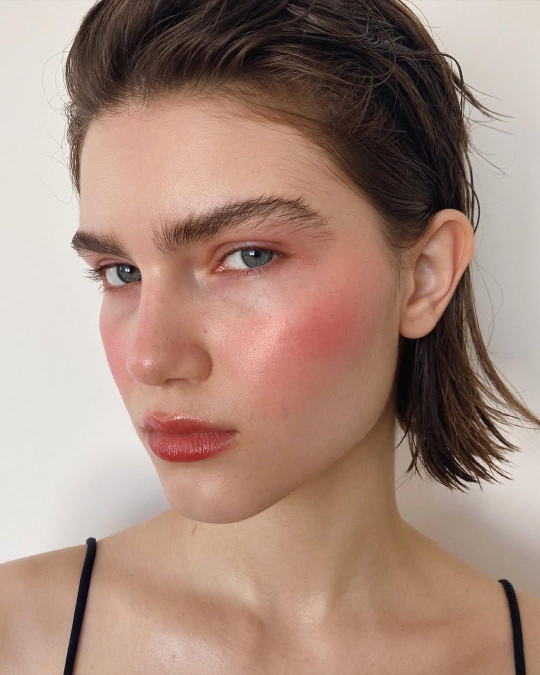 Румяна — главный герой этого образа. Причем наносить их нужно не капельку для свежести, а очень даже активно. Оттенки выбирай ягодные, красные, насыщенные розовые. Наноси их щедро на яблочки щек и немного выше, не бойся заходить на переносицу. Этот прием сделает лицо живым, юным и даже немного влюбленным.