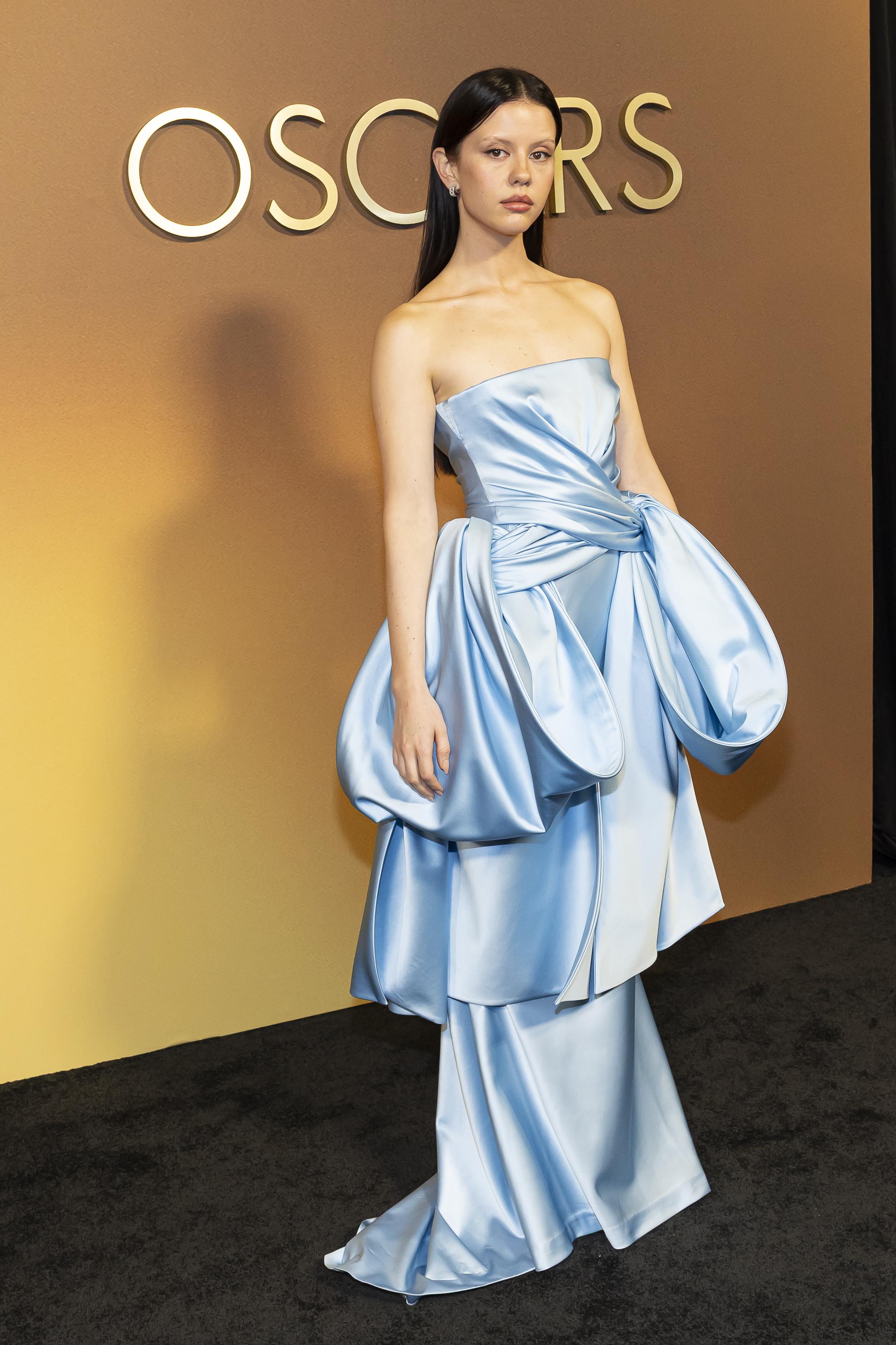 Миа Гот также выбрала Dior. Шикарное длинное платье голубого цвета с атласным блеском выглядит безумно нежно. А его необычный крой делает образ по-настоящему уникальным. Прямые волосы без аксессуаров идеально вписываются в лук. Они не перегружают его, а только украшают.