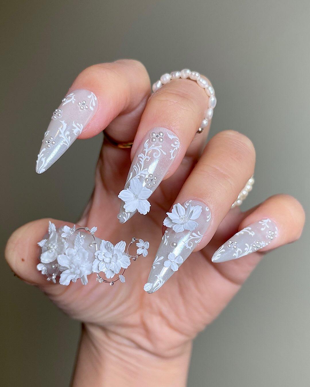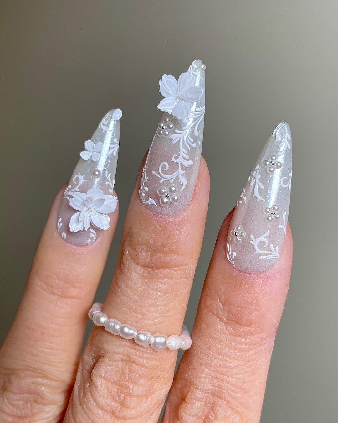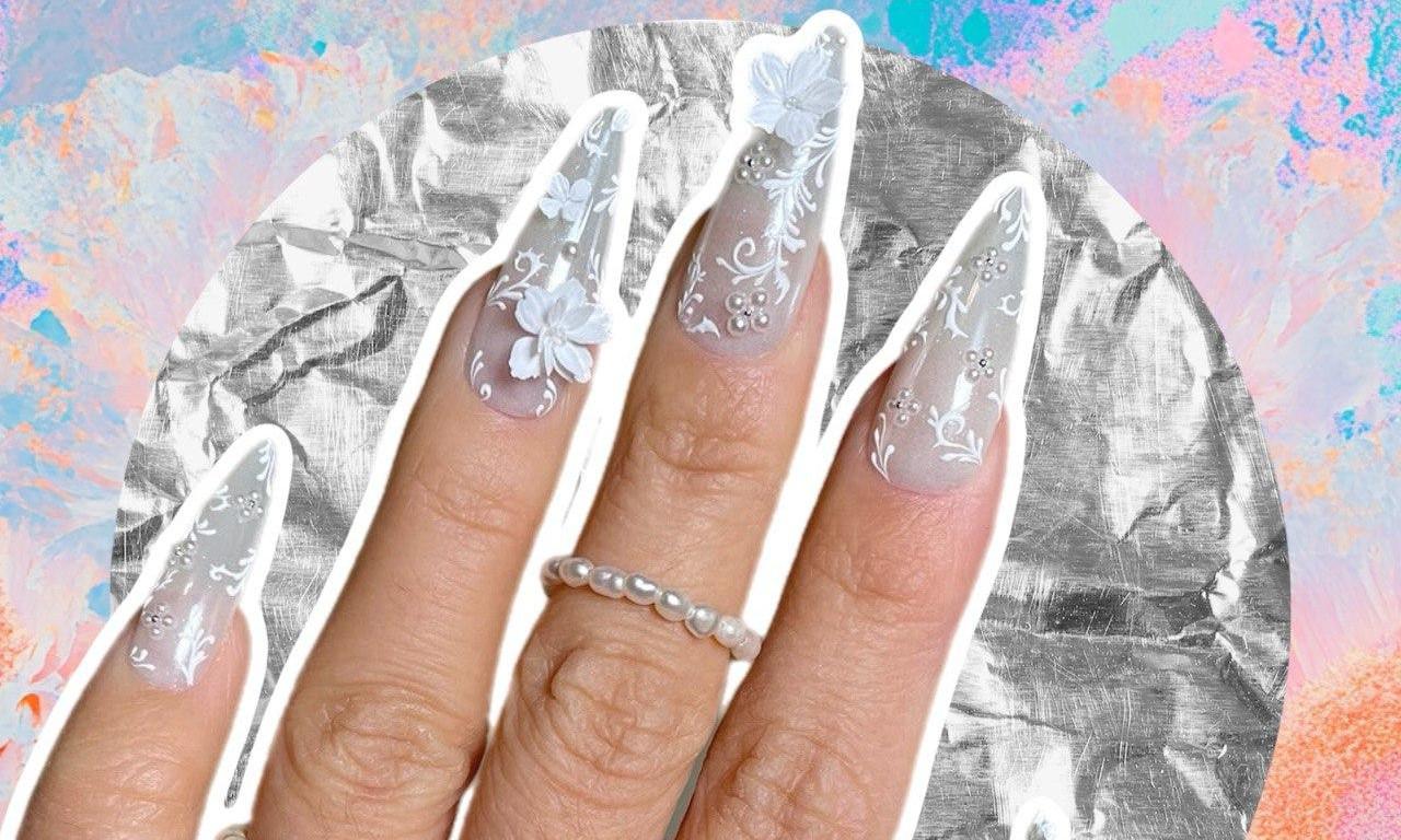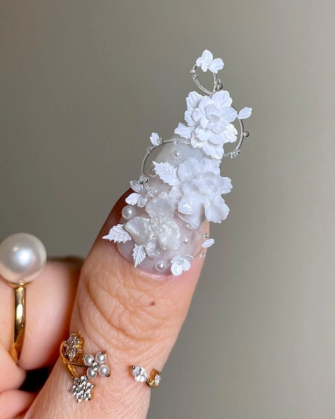 Центральная часть дизайна — объемные белые цветы, расположенные на нескольких ногтях. Они выглядят как миниатюрные фарфоровые элементы, аккуратно закрепленные на поверхности ноготков. Лепи их из геля-пластелина тонко и деликатно: цветы не должны выглядеть тяжелыми или громоздкими, несмотря на объем.