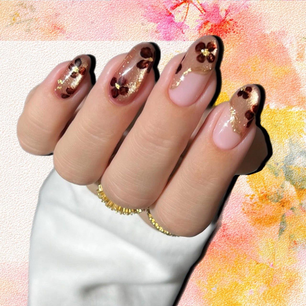 Этот вариант можно назвать самым удачным, кстати. Этот простой рисунок можно вписать в очень разнообразные виды маникюра: пастельный, блестящий, роскошный, по-детски милый. Даже с осенними мотивами он выглядит круто. Лови, как носить простой цветочный рисунок в красивом сезонном маникюре 👇