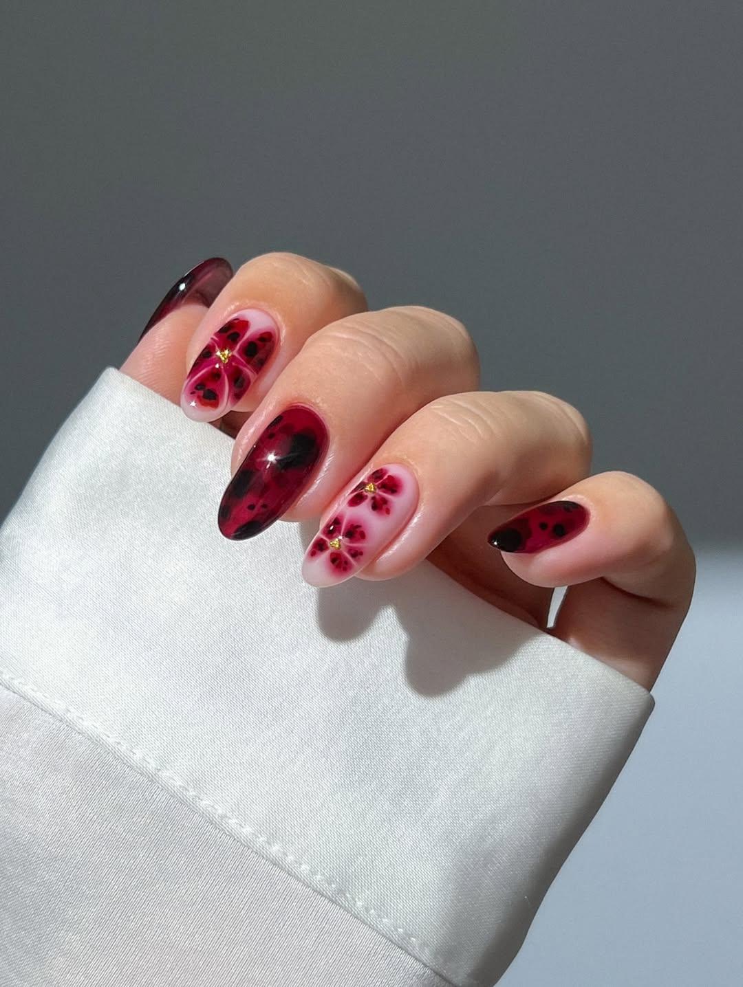 Это не самый сложный дизайн, поскольку на ногтях будет всего два рисунка. Давай начнем с того, который расположен сразу на всем ногте. Для начала нужно покрыть пальчики полупрозрачным бордовым лаком. Нанеси его в один тонкий слой, а потом более темными и плотными цветами (можно взять даже черный) нарисуй пятнышки в хаотичном порядке.