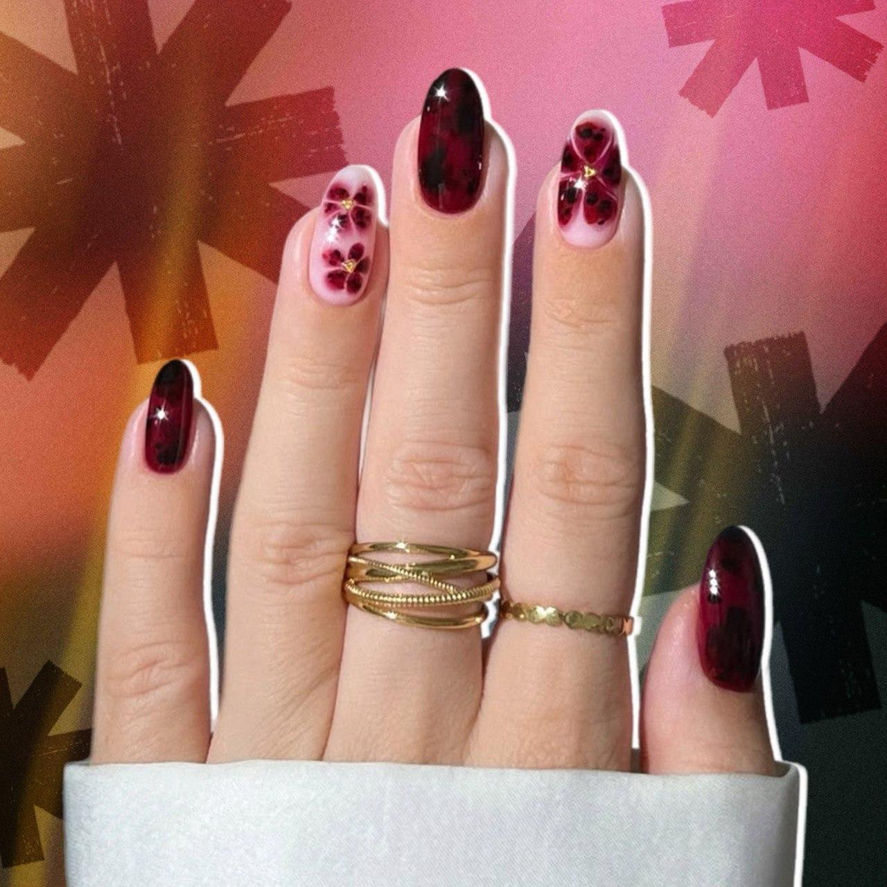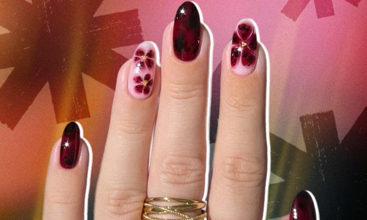 А если не хочешь носить однотонный маникюр, то лови необычную идею дизайна в бордовом цвете. Сочетание розовой основы, оттенка бургунди, золота и цветочных элементов — лучшая комбинация сезона. Уверена, в твои будни этот дизайн впишется просто превосходно!