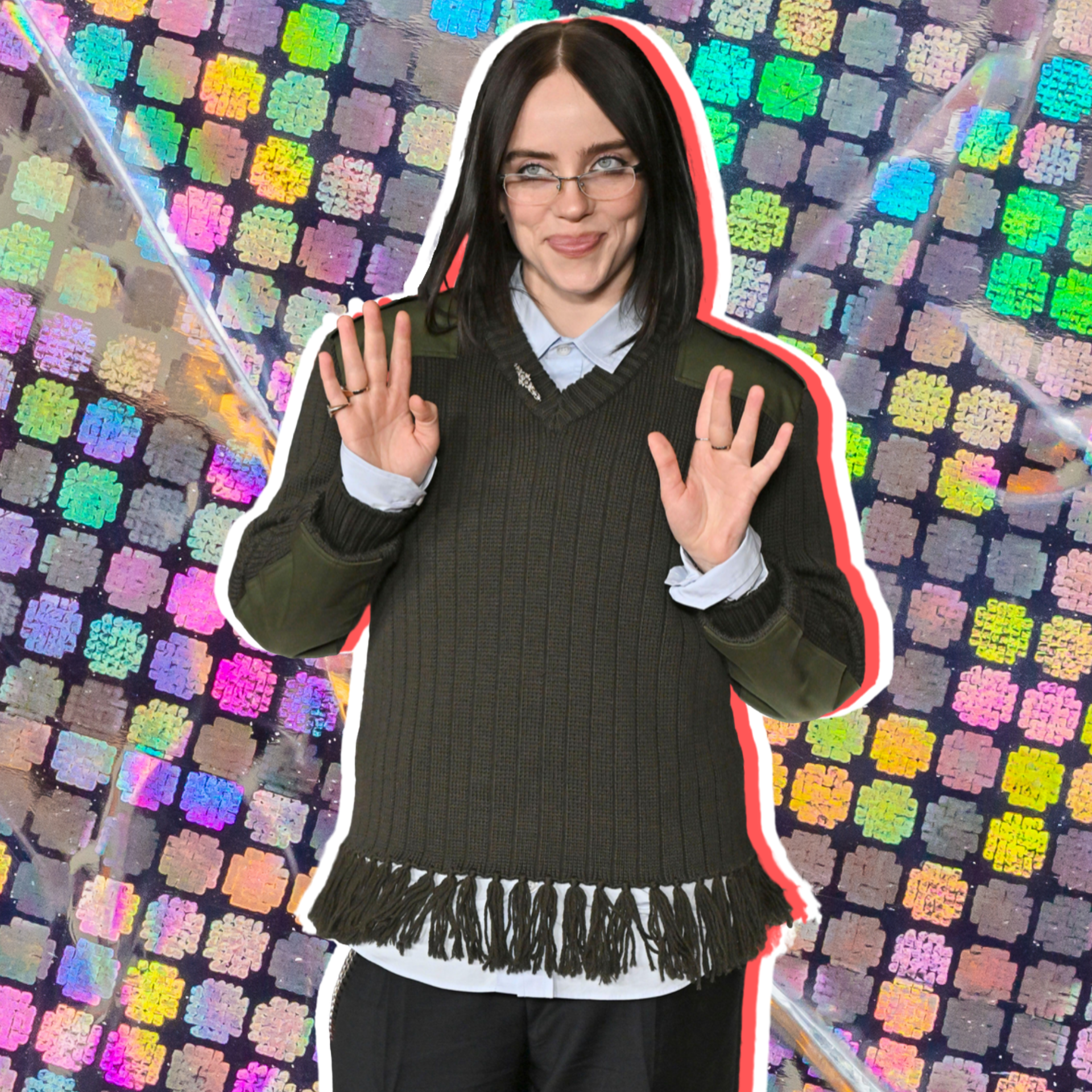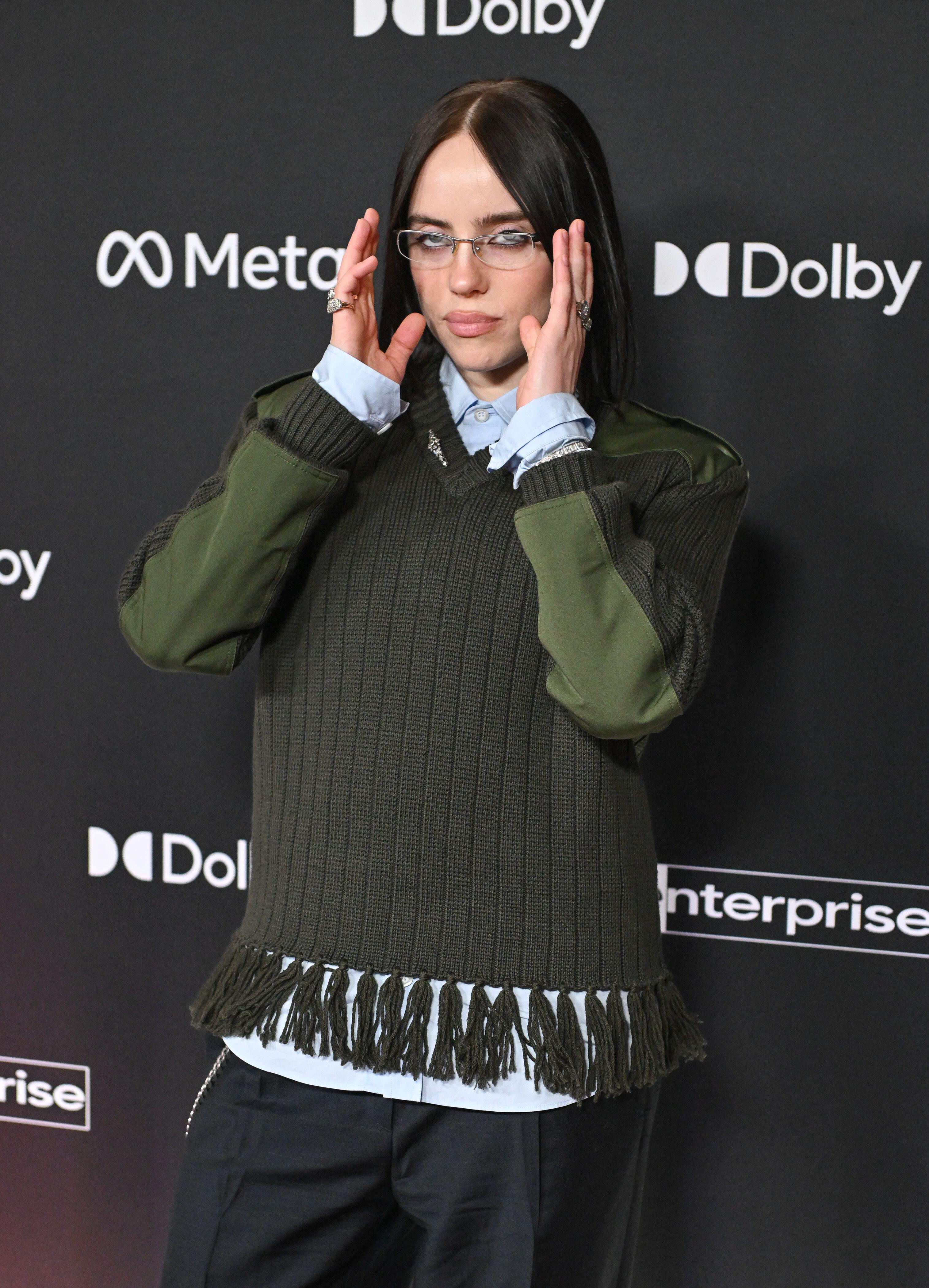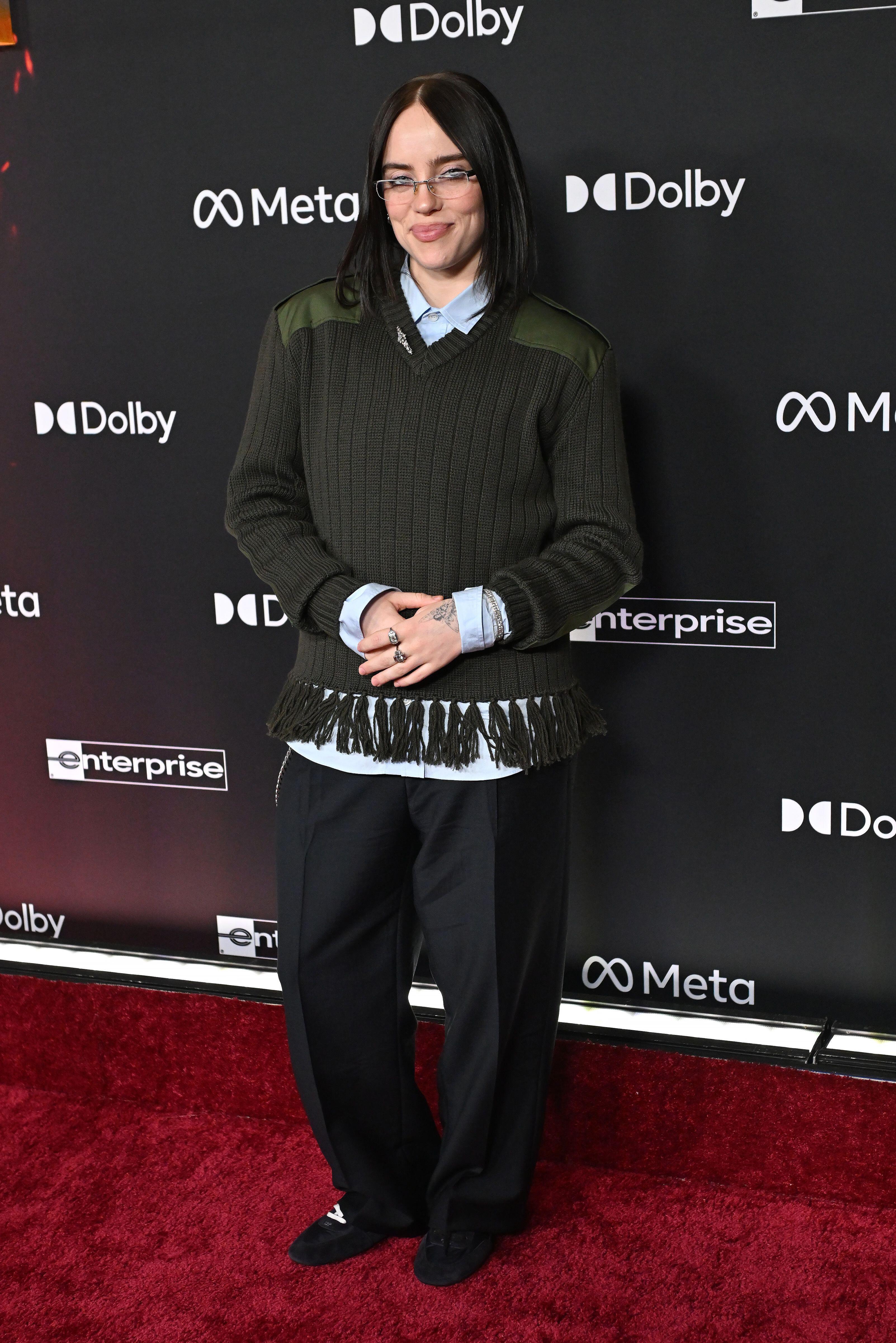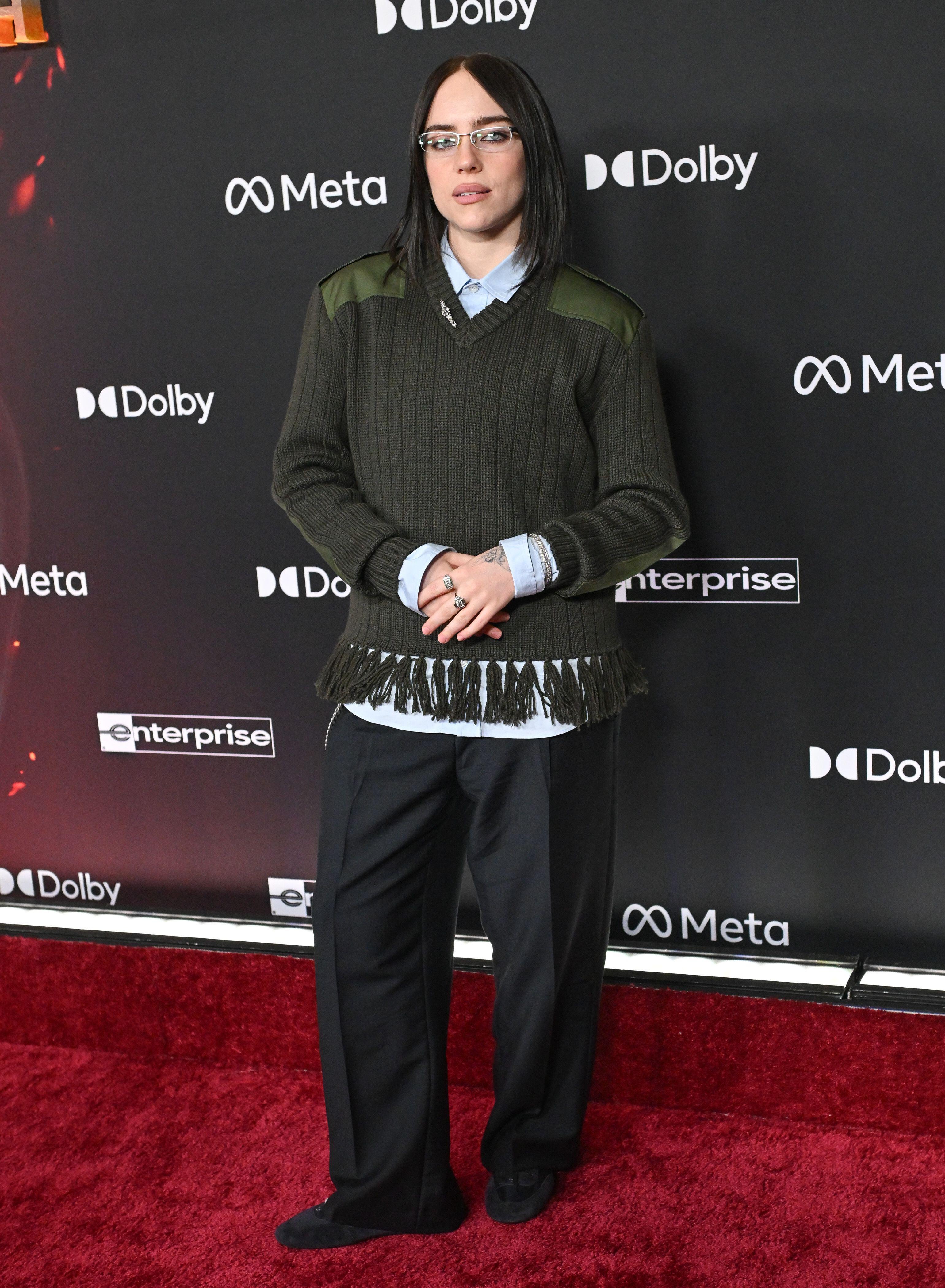 Для выхода на красную дорожку Айлиш выбрала образ в фирменном для себя духе современного преппи — свободный, практичный, с явным уклоном в утилитарность. На ней был темно-оливковый вязаный джемпер с V-образным вырезом, плотной фактурной вязкой и вставками цвета хаки на плечах и предплечьях — они напоминают армейские нашивки и добавляют строгий штрих.