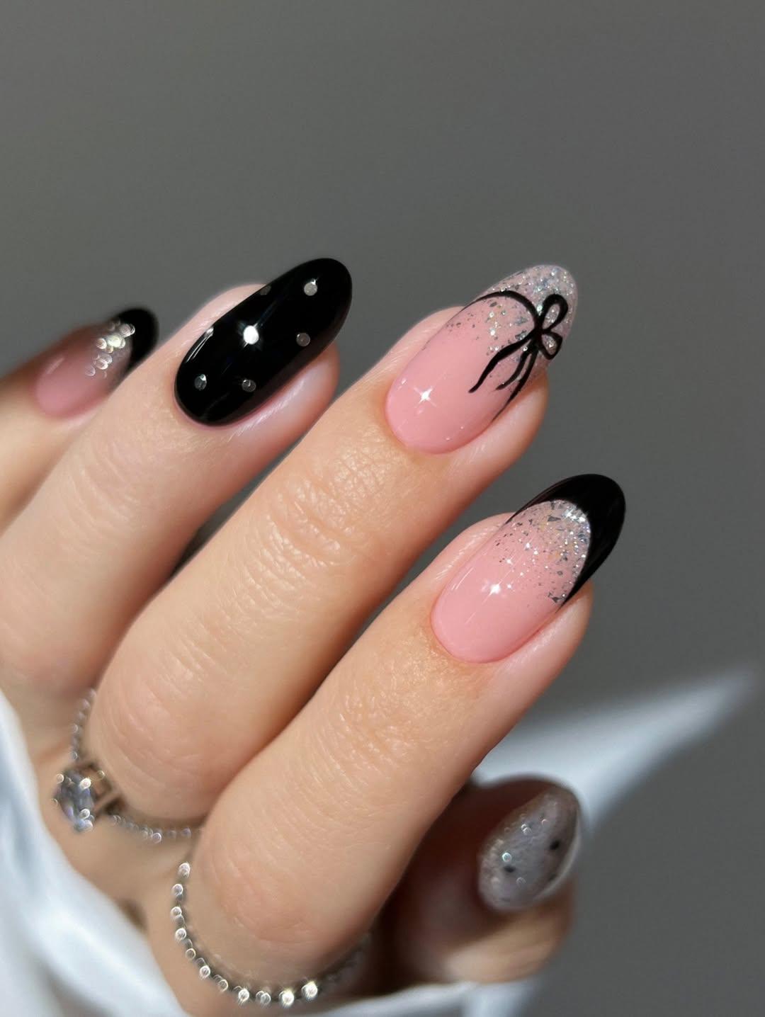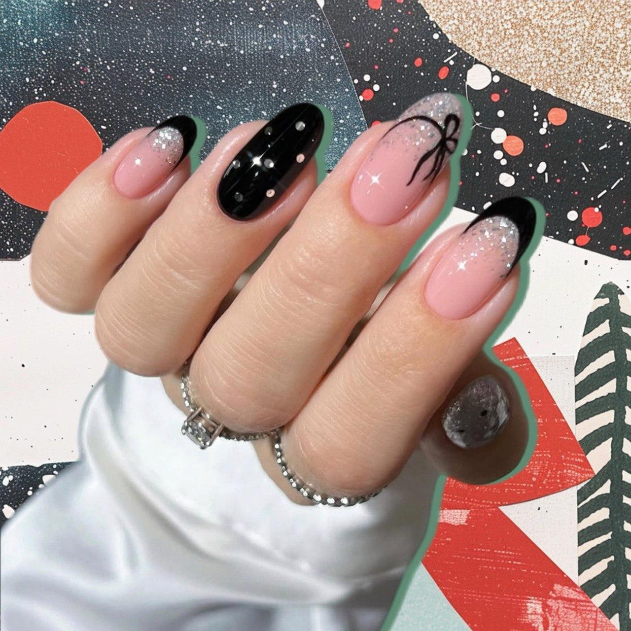 Черный френч с серебряными акцентами, градиентами, горошком и даже бантиками — это классный баланс сразу нескольких эстетических направлений. Этот маникюр одновременно строгий и кокетливый, универсальный и запоминающийся. Именно такой нейл-дизайн идеально вписывается в зиму 2026 года. Давай повторять!