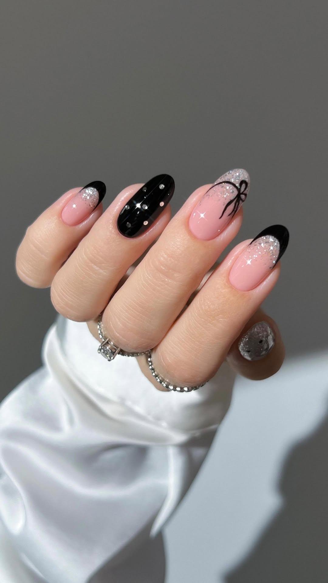 Ну а самым милым нейл-артом станет серебряный градиентный френч с черным бантиком. Если все предыдущие варианты выглядят очень минималистично, то этот — настоящее воплощение романтики.