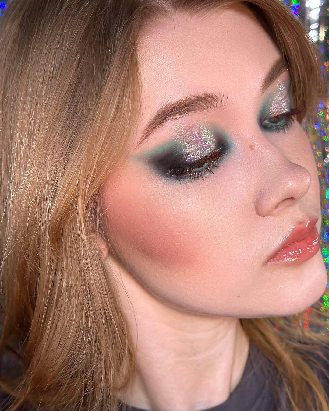 Завершает эту подборку макияж в блестящих оттенках, который может напоминать сияние любого драгоценного камня. Если насыщенные цвета вроде изумрудного и сапфирового кажутся тебе слишком вызывающими, выбирай его. Это не активный глиттер, а деликатные детали: легкий шиммер, блики хайлайтера, сияющая кожа.