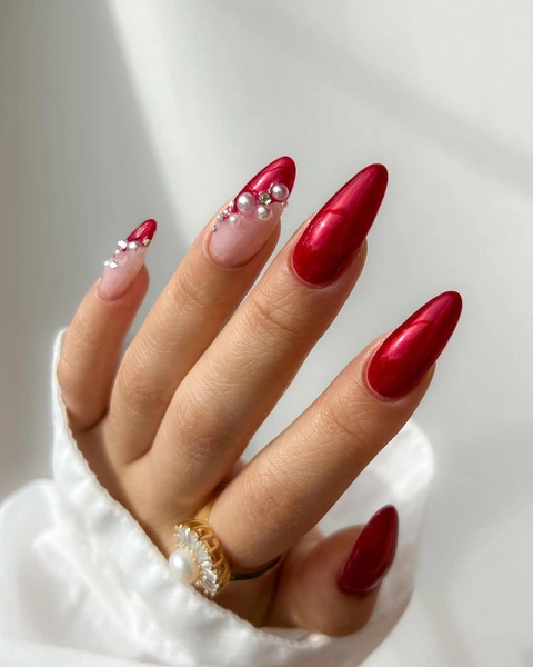 Тем, кто любит элегантные дизайны ногтей, красный нравится не всегда. Но если хочется сделать денежный цвет, то перламутровый лак алого оттенка отлично впишется в праздничный образ. Дополни его жемчужными стразами, чтобы сделать маникюр наряднее.