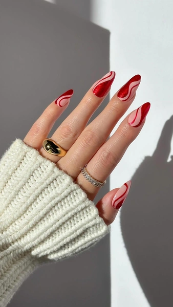 Символ 2026 года — Красная Огненная Лошадь, поэтому все маникюры должны быть алыми и блестящими. Самый простой вариант — это однотонное покрытие, но разве оно выглядит прикольно? И да, и нет. Так что советую заменить его на простой дизайн. Комбинируй широкие и узкие линии на ногтях. Для тонких полосок будет нужна отдельная кисточка, а остальные вполне можно нарисовать и той, что есть во флакончике лака.