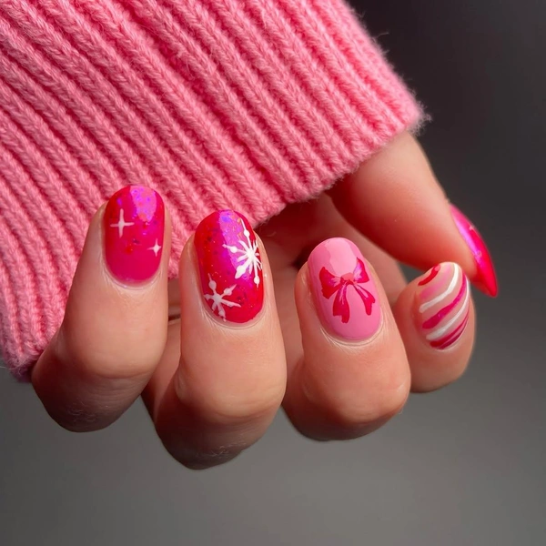 Некоторым бордовый кажется слишком темным, а красный вульгарным. В таком случае обрати внимание на более светлый оттенок — розовый. Гамма Барби очень актуальна в Новый год! А еще такие цвета чудесно выглядят в сочетании с зимними мотивами: снежинками, звездочками, бантиками. А если добавить блесток и алых рисунков, то получишь невероятный новогодний маникюр, которого у других точно не будет.