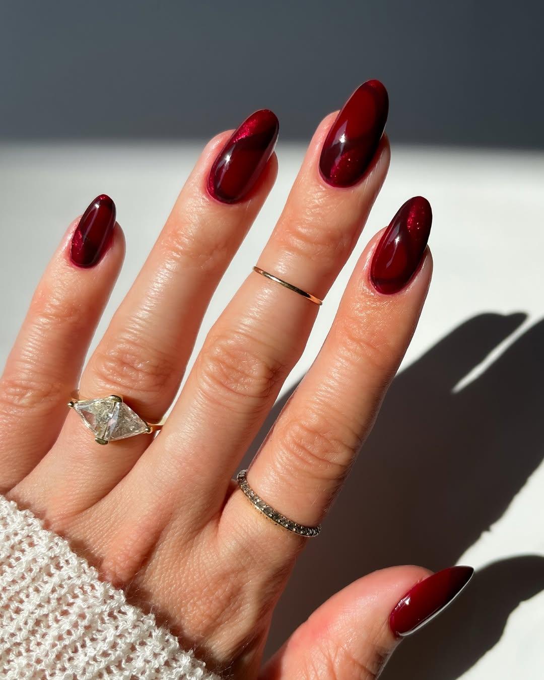 Кому-то чистый красный цвет не идет или просто не нравится, но надо помнить, что у него много оттенков. Бордовый один из них. И да, в Новый год 2026 он тоже будет денежным. Комбинируй на ногтях винный тон и более темный его оттенок с красивым блестящим лаком. Такое сочетание привлечет если не деньги, то восхищения и комплименты уж точно!