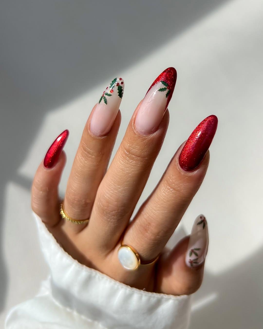 Френч всегда смотрится красиво и уместно. Если у тебя длинные ногти, то такой маникюр будет лучшим вариантом. Но если хочется сделать его интереснее, замени обычный красный кончик на узор из остролиста с ягодами. Этот дизайн ногтей сочетает в себе баланс нарядного стиля и новогодней яркости.