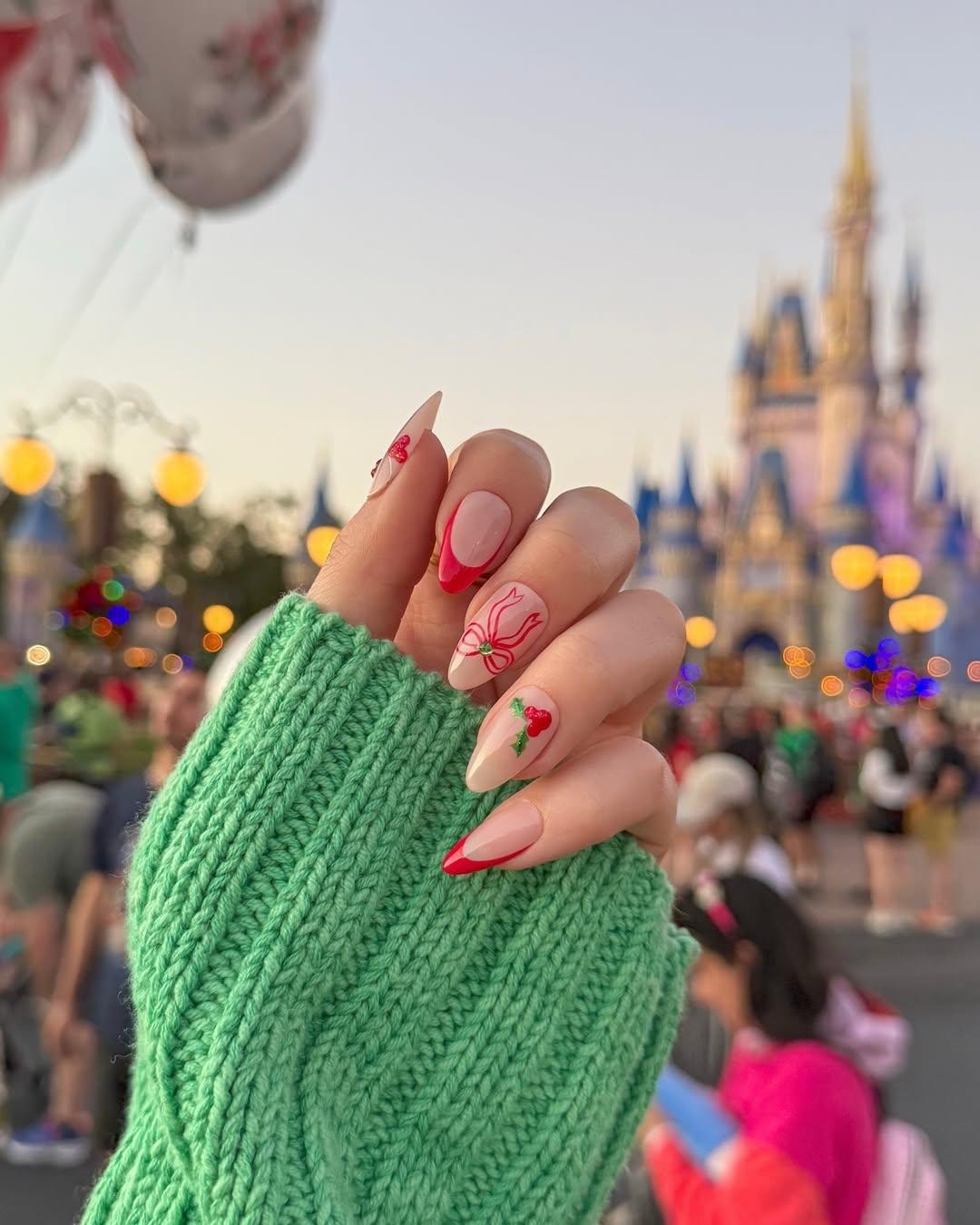 Если любишь рисунки, то в новогоднем денежном маникюре они будут смотреться очень круто. Основой дизайна сделай бежевый цвет, а на некоторых пальцах пусть будет красный френч. Зато остальные можно украсить всякими прикольными узорами. Остролист с яркими ягодками или бантик со стразой в центре — прекрасные варианты. Тем, кто не умеет рисовать, на помощь придут наклейки и слайдеры.