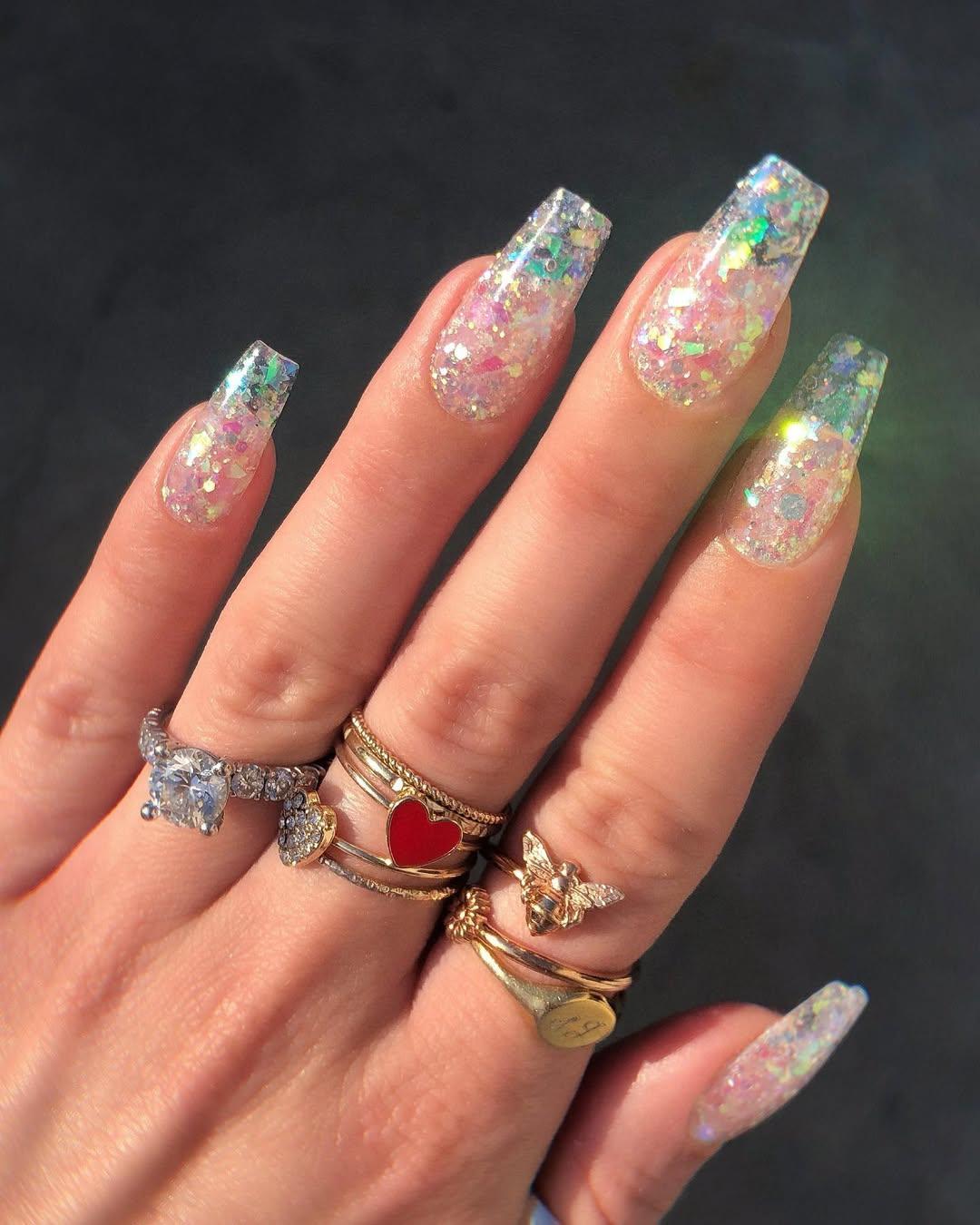 Опал нравится тем, кто хочет носить на ногтях что-то нежное и воздушное, но при этом не скучный нюд. Его молочные и радужные переливы смотрятся ну очень эффектно! Проще всего его сделать, если нанести топ с опаловым глиттером на полупрозрачный лак.