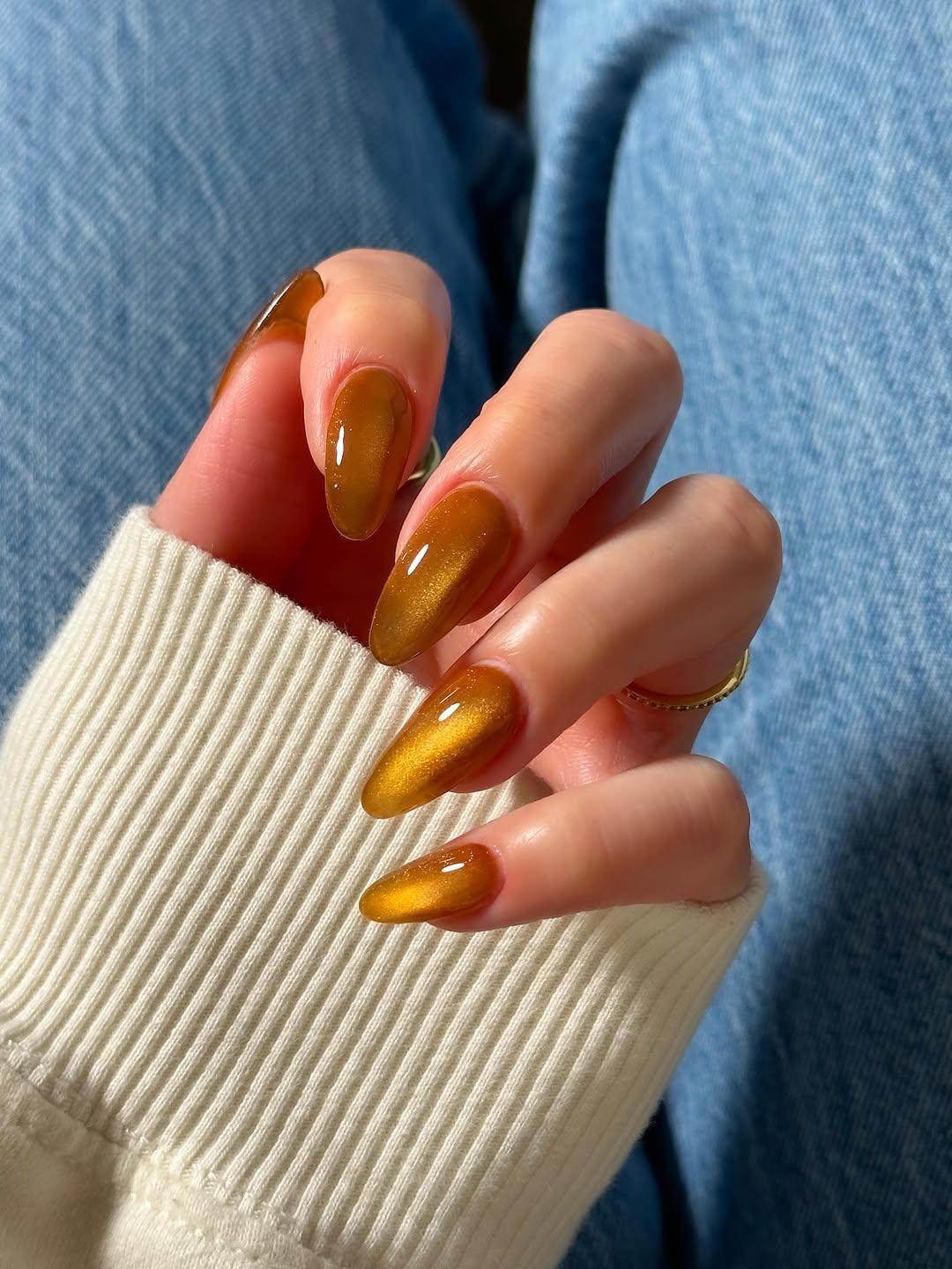 Янтарь традиционно ассоциируется с теплом и уютом. В январе это особенно актуально, потому что месяц этот обычно бывает серым и холодным. Так что маникюр в янтарных оттенках точно поможет согреться! Особенно круто этот цвет выглядит с «кошачьим глазом».