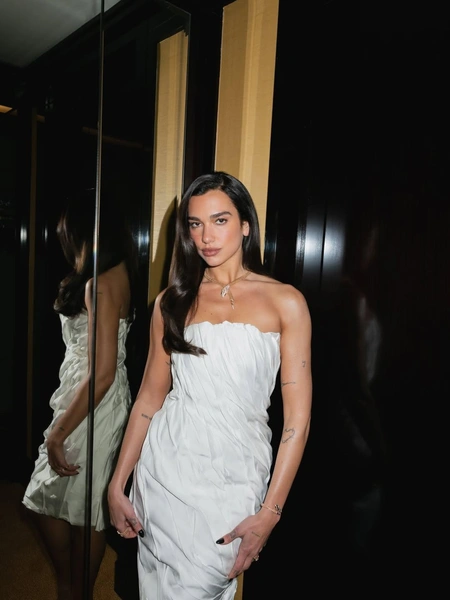 Кожа Дуа в этом образе сияющая, но в меру. Советую начать макияж с ухода за кожей. Сияние, но не из космоса даст добавление в уход ниацинамида. Этот компонент сдерживает себум, поэтому лицо меньше жирнится. А увлажняющий крем решит проблему питания. Так ты добьешься баланса!