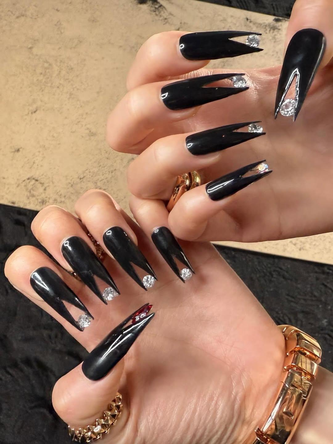 Ну а этот маникюр точно оценят смелые девушки, которые не боятся экспериментов. Джису вновь выбрала длинные ногти, но в очень необычной форме — кончик каждого ногтя раздвоен на манер змеиного языка. Между этими двумя частями расположены крупные прозрачные стразы. Выглядит все это футуристично и очень роскошно!