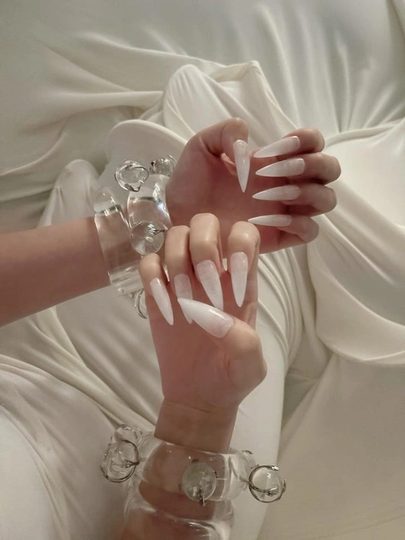 Для этого маникюра Джису выбрала длинную острую форму вроде стилета или миндаля с острыми кончиками. Такие ногти выглядят одновременно агрессивно и элегантно, а еще очень круто визуально удлиняют пальцы. Основа — молочный лак, который сам по себе смотрится очень нежно. Но главный акцент — его текстура. Она напоминает иней или какой-то густой белый дым.