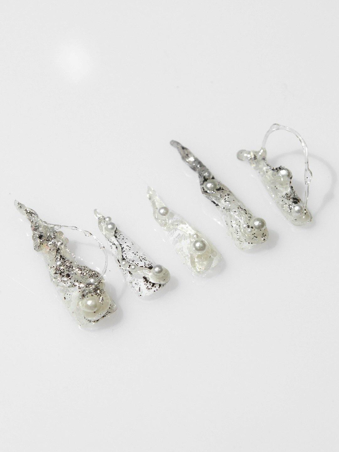 Второй маникюр Джису точно оценят поклонница всего блестящего и переливающегося. Основа — полностью прозрачные и очень длинные типсы с заостренными кончиками. По всей поверхности распредели лак с крупным серебристым шиммером. Нужно создать эффект осколков зеркала, разбросанных по ногтю. Чтобы немного скрыть прозрачность, наноси его на молочную базу.