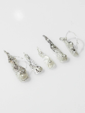 А затем добавляй объемные абстрактные элементы, выполненные из жемчужного геля. Поверх украшай ногти перламутровыми стразами в виде жемчуга. Не забудь хорошенько их закрепить, чтобы они не отвалились. Главное — не переборщить с количеством декора, чтобы сохранить воздушность маникюра, а не придать ему вид елочной игрушки.