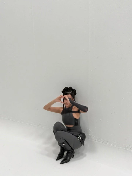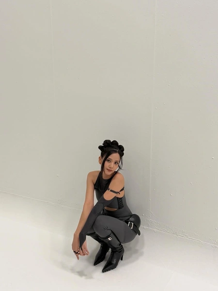 Джису сочетала эту необычную укладку с довольно минималистичным макияжем. Для лица она выбрала матовый тон с легкими румянами, а на губы нанесла светло-розовый тинт с бархатной текстурой. В макияже глаз певица остановилась на тонких стрелках и деликатном покрытии ресничек тушью. Образ получился свежим и очень весенним!