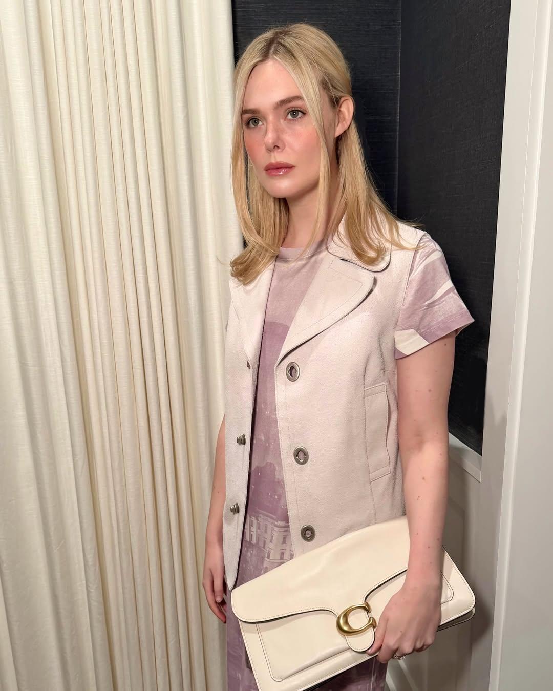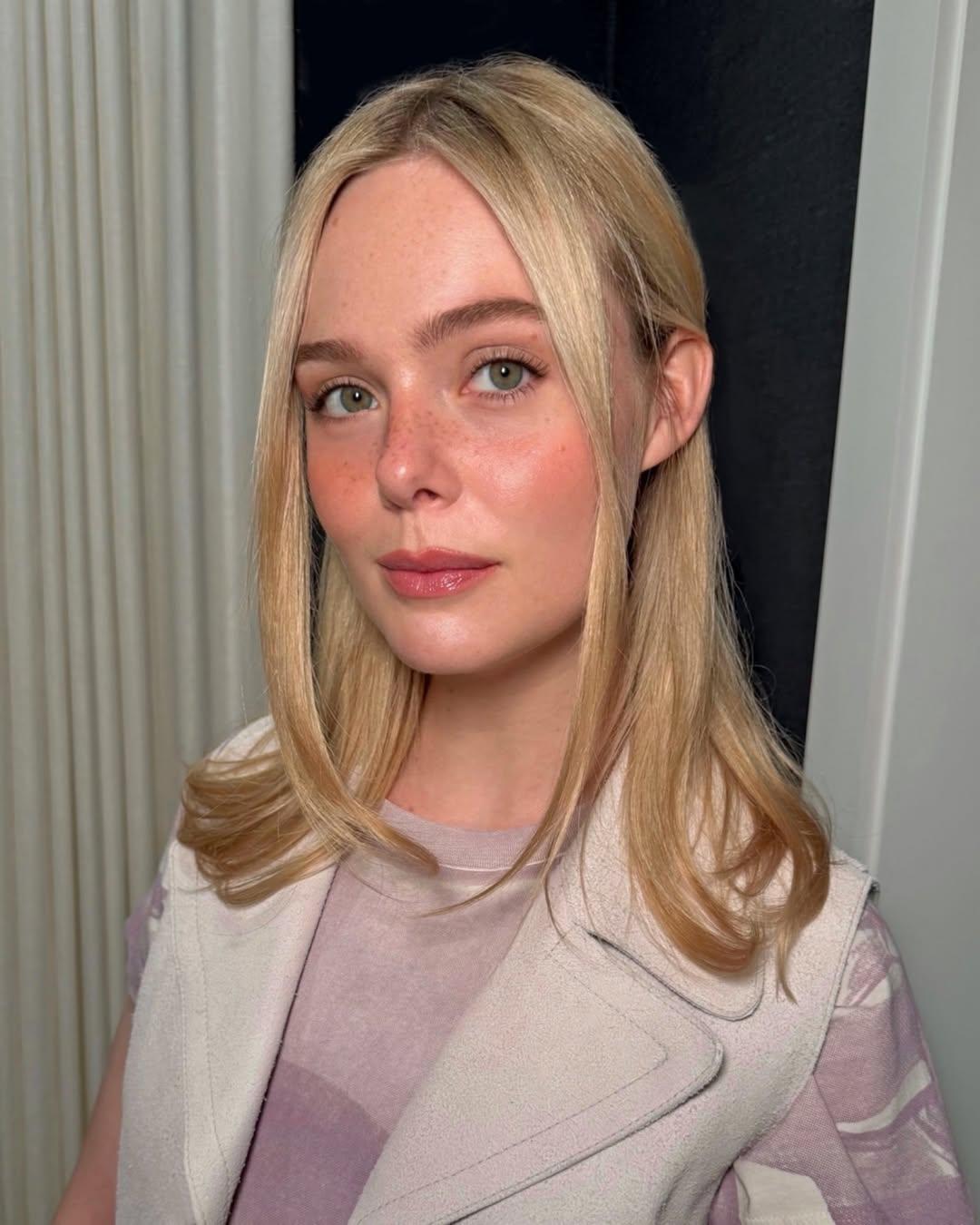 Эту укладку Эль сочетала с лавандовыми платьем и жилетом. Нежный цвет одеяния красиво подчеркнул изящность прически девушки. Отличным дополнением стал и макияж в светлых оттенках. Фаннинг выбрала розово-персиковые цвета — это ее любимая гамма, которая красиво смотрится на ее внешности.