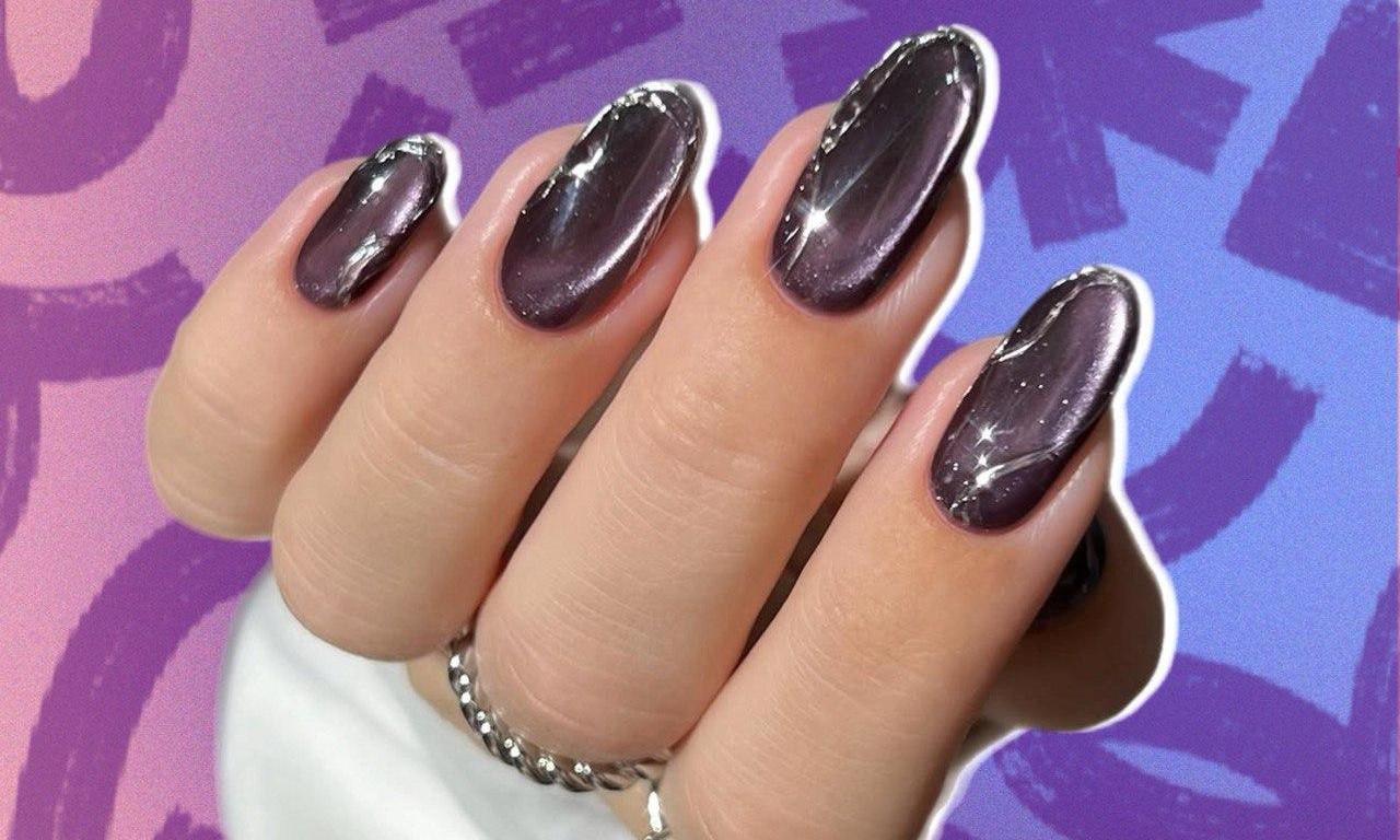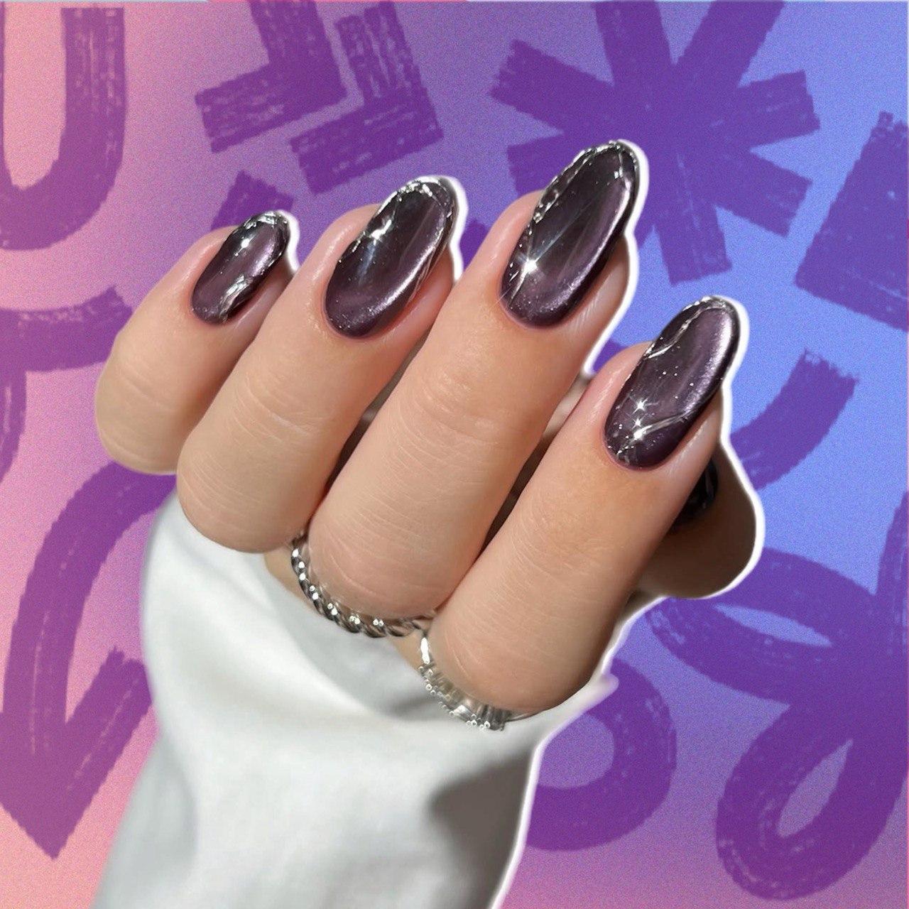 Ну а если просто хочется чего-то хэллоуинского и нарядного, но при этом не страшного и без рисунков, то и для тебя много вариантов. Один из них — фиолетовый магнитный маникюр, украшенный объемными серебряными линиями. Давай разбираться, как его сделать 👇