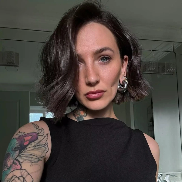 Глубокий боковой пробор в этой прическе смещает всю массу волос на одну сторону, создавая драматичный, несимметричный силуэт. С одной стороны локоны падают объемной волной, закрывая часть лица. С другой — открывают ухо и скулу. Длина остается классической для французского боба — до уровня челюсти. Главное отличие от классики именно в проборе и способе укладки.