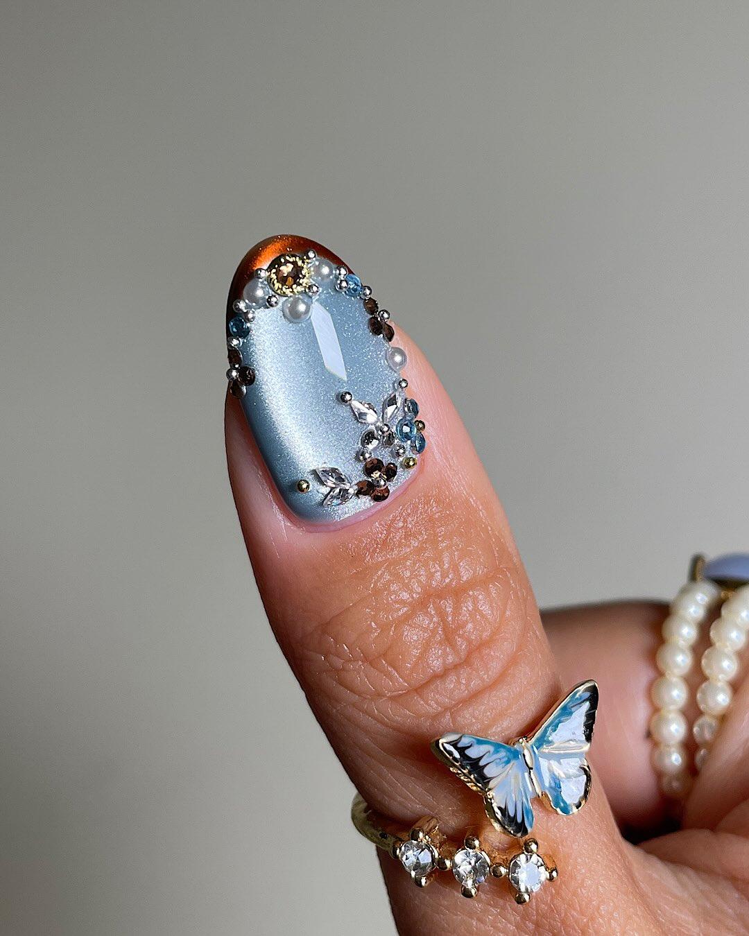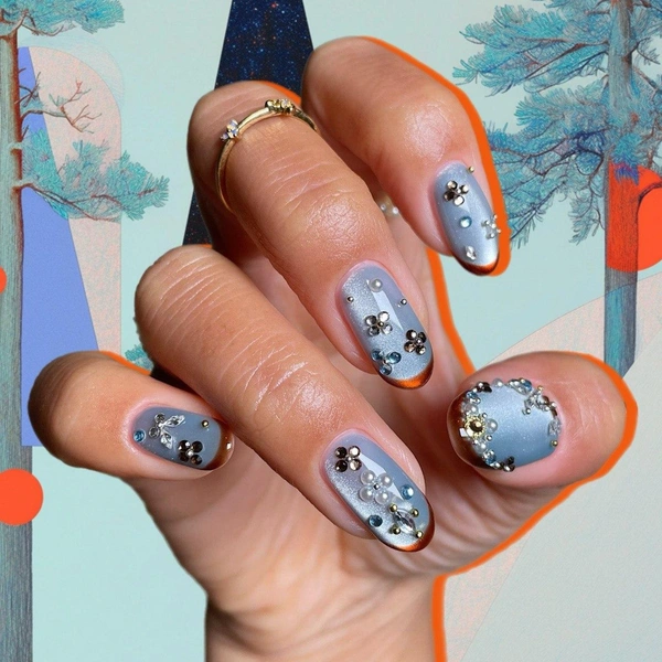 Покрой ногти серо-голубым лаком с эффектом «кошачий глаз». Я бы выбирала шелковую «кошку», но и варианты с крупными блестками смотрятся хорошо. Обязательно хорошо обработай магнитом каждый ноготь, чтобы блики были яркими и одинаковыми на всех пальцах. Самые простые варианты — сияние в центре или сбоку.