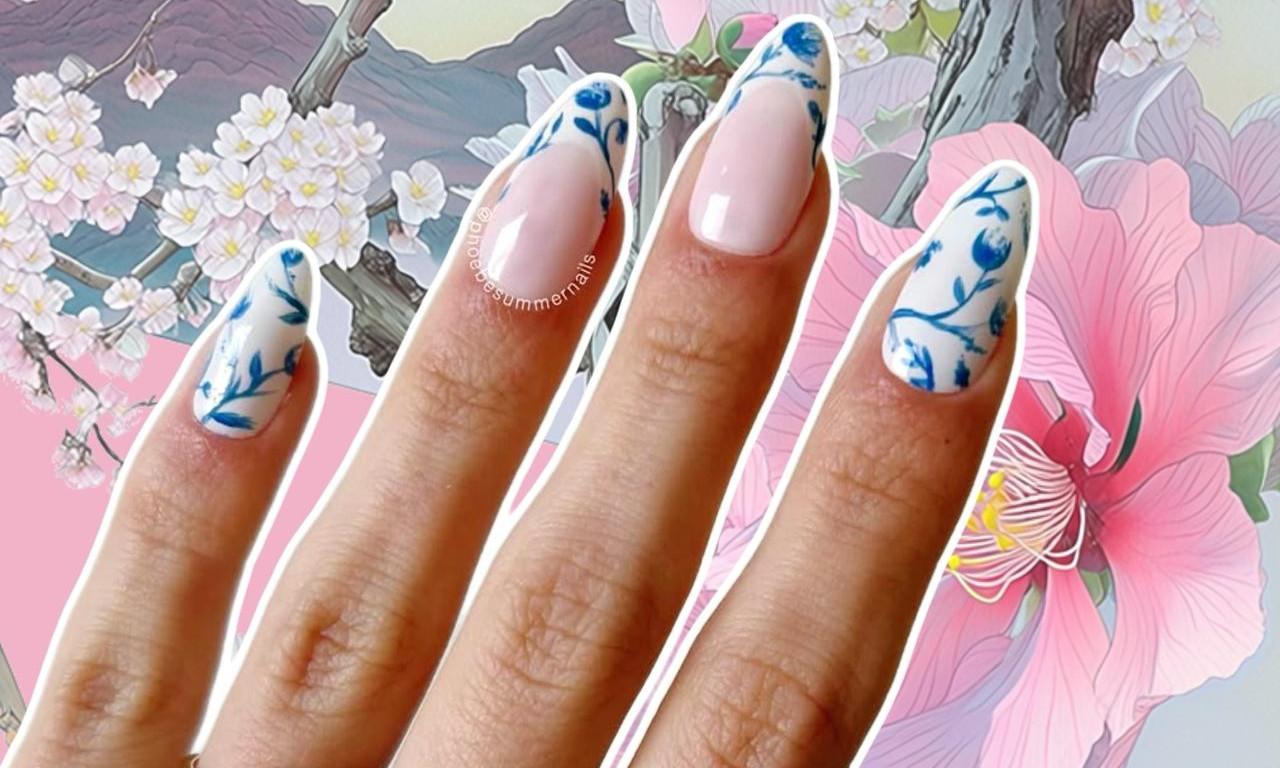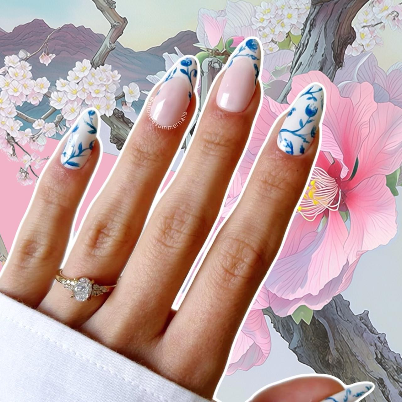 Ну а если ты любишь более нежные маникюры, то смело выбирай этот вариант маникюра! Единственный нюанс в том, что нужно будет рисовать на самих кончиках, так что ногти должны быть длинными. А вот их форма не так уж важна: и миндаль, и квадрат будут смотреться хорошо. На двух ногтях с молочным лаком нарисуй белый фарфоровый френч. Остальные ногти покрой этим цветом в однотон. А потом рисуй синим лаком цветы, листочки и стебельки, напоминающие узоры, которые бывают на посуде.