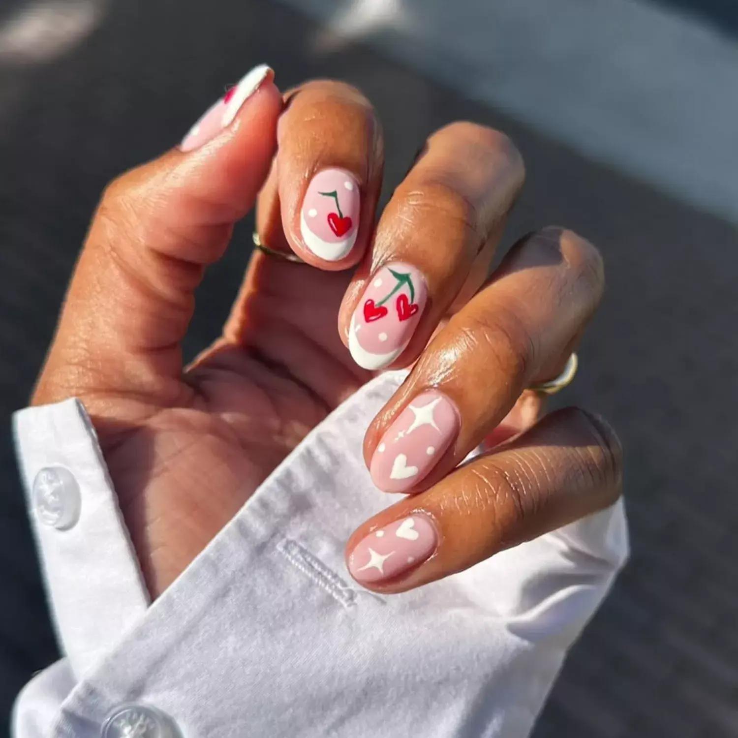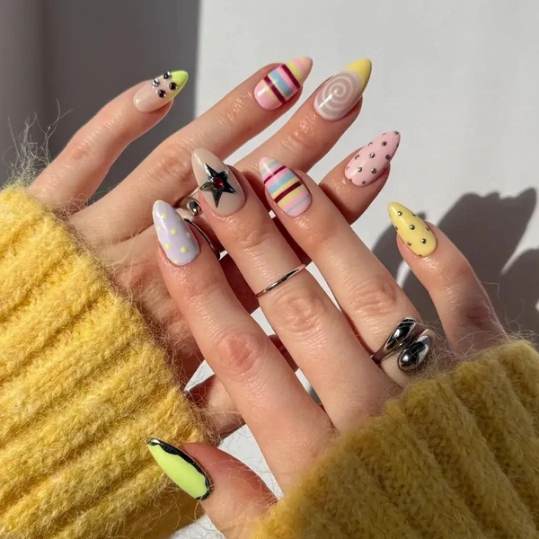 На других пальчиках делай дизайны в похожей гамме и с веселыми и яркими дизайнами. Тут может быть и стильный узор в полоску, и разноцветные варианты дизайна в горошек, и блестящая звезда, и однотон с блестящей рамкой. Френч будет классно смотреться со всем!