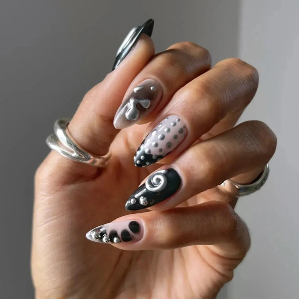 Для остальных ногтей выбирай что-нибудь смелое и нарядное. Например, сделай черный градиент в виде ауры и укрась его каплями из серебристого объемного геля. Такой же дизайн можно разместить на однотонном черном покрытии и расплывающихся пятнышках.