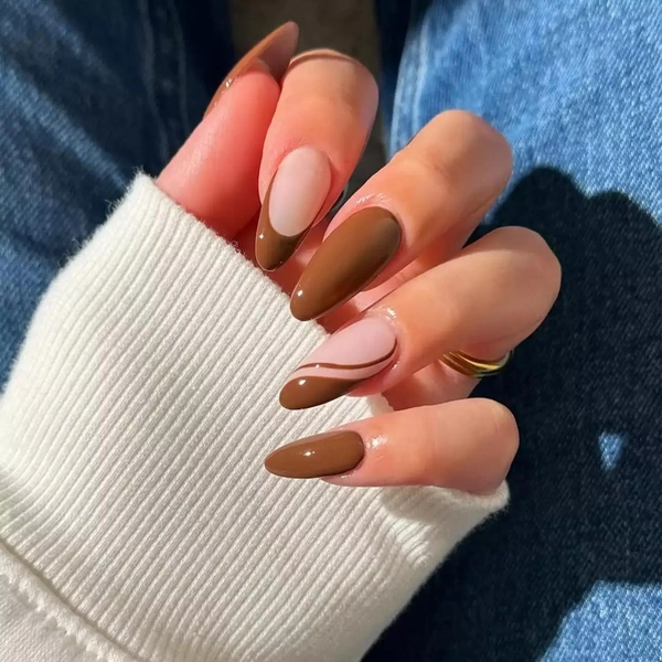 Начну с самого яркого маникюра! В нем каждый ноготь украшен разными лаками и рисунками. Пальчик с френчем всего один, зато какой красивый 💅 Сначала покрой ноготь любым нюдовым лаком, который будет сочетаться со всеми цветами. Идеальный вариант для всех — молочный. Затем бери белый лак и тонкую кисть и рисуй спираль от центра ногтя к периферии. Заверши всю эту красоту френчем в нежном желтоватом оттенке сливочного масла.