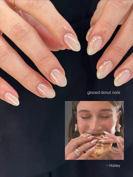 Эстетика маникюров со втиркой, вдохновленных глянцевым блеском сахарной глазури на пончиках, закрепилась в маникюрных трендах уже давно. Несколько сезонов назад Хейли Бибер похвасталась такими ноготочками, и девушки по всему миру стали их повторять. Конечно, жемчужная втирка не была новинкой, но именно Хейли сравнила ее с глазурью пончика.