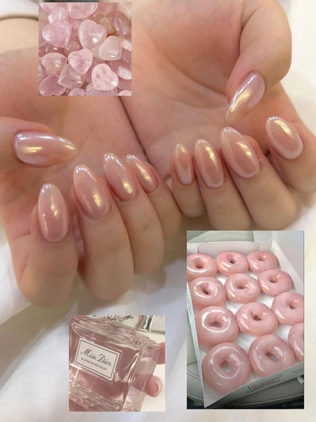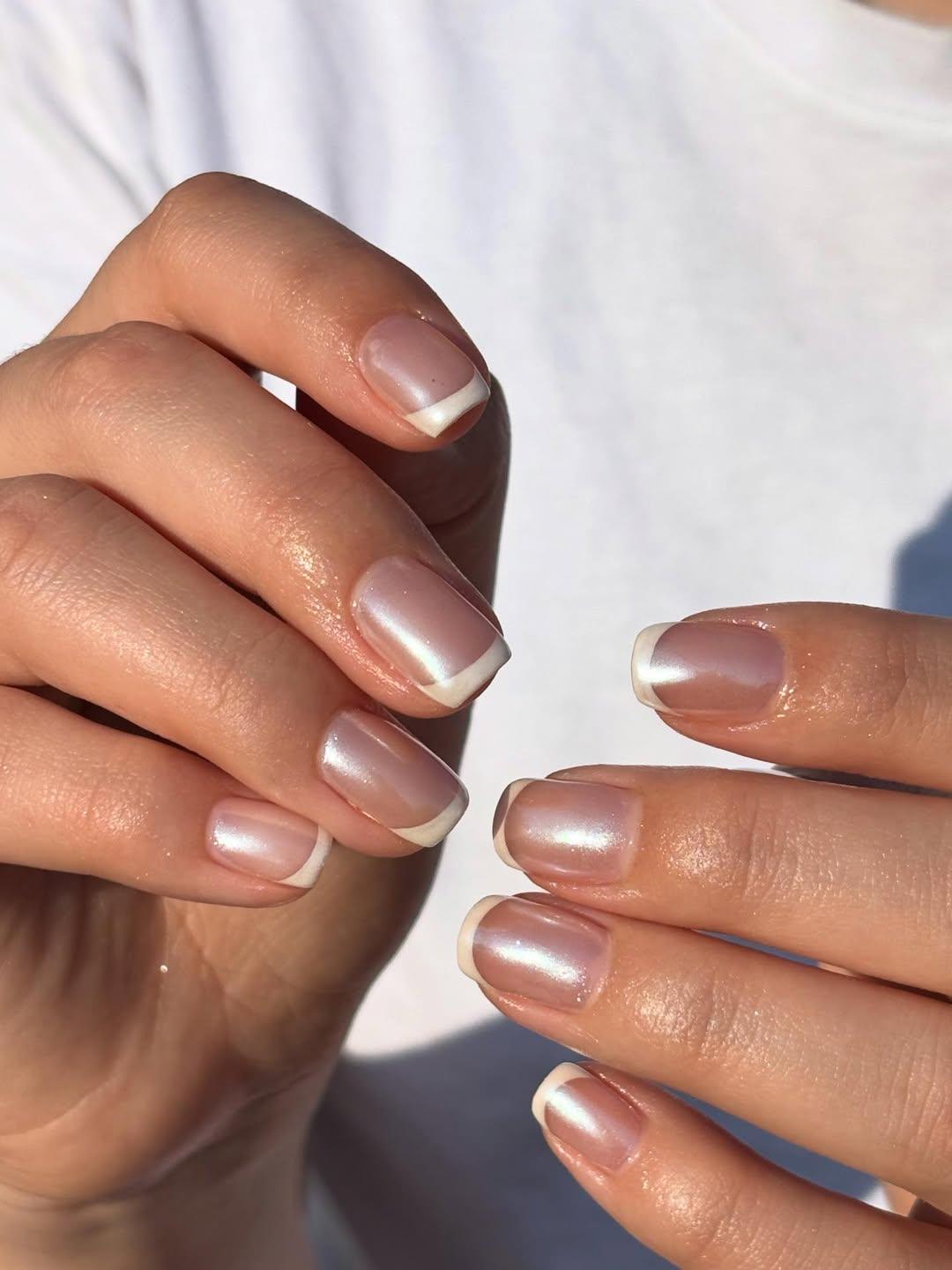 Это тот самый дизайн, который стал эталонным. Полупрозрачная база, розоватый или нюдовый оттенок, жемчужная втирка и глянцевый топ — идеальное комбо для самых изящных ногтей. Если любишь «чистые» и одновременно дорогие маникюры, то это самый подходящий вариант. В любой ситуации он будет удивительно хорош!